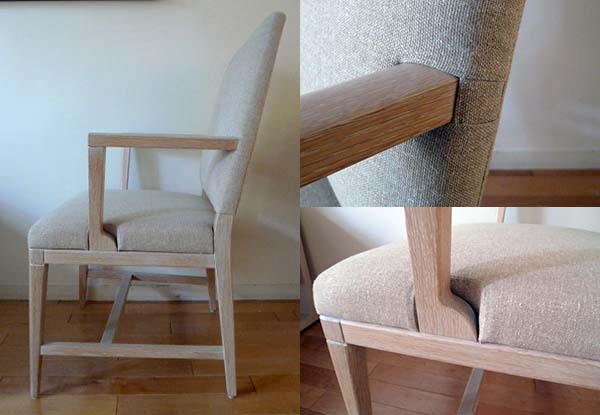 最大の特徴は、サイドチェアで幅480㎜、アームチェアで幅600㎜とゆったりとしたサイズ感。背も通常のダイニングチェアは100度ですが、よりリラックスできるように背当たりで110度傾けました。座は弾性ベルトをクロスに編み、その上に固さの違うウレタンフォームを多層に置き、ソファのような掛け心地を実現。座面はメンテナンスしやすいように取り外しが可能です。背は樹脂製ベルトのクロス編みにウレタンフォームを多層に置き貼り込みました。フレームはホワイトオーク材で、長く使える堅牢度と豊かな表情を出しています。今回NEOCLASSICO Heritageには使い込まれた上質なイメージを残しつつ、ナチュナルなヴィンテージ感を出した染色塗装、ヴィンテージホワイト(D-6)とヴィンテージブラック(D-7)を新たに用意しました。