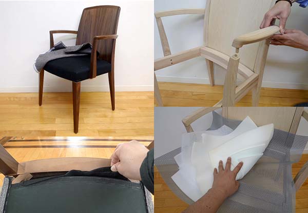 さらに背の仕様を成型合板で仕上げたタイプと、背座共カバーリングシステムを採用したタイプの2種類を用意しました。無垢感のある背は、3次元に成型した3mm合板のフラッシュ構造です。上下で厚みが異るフラッシュ構造を可能にしたのは、現代の加工技術があってこそ実現しました。フラッシュ構造にしたことで、精度と強度が向上し軽量化にも繋がりました。3次元成型合板の柔らかな背のカーブに合わせて、緻密に仕上げられた無垢材のフレームが滑らかに連なるよう加工しています。