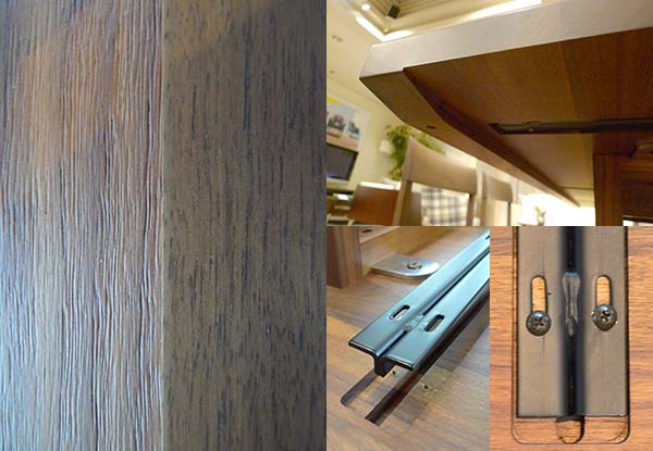 MD-107Lは、全て無垢材を使用しています。無垢材は反りや収縮が生じやすいデリケートな素材です。そのため反り止め材を天板裏に木目に対して交差して取り付けています。反り止め材には動きの少ない、強度のあるスチール製の反り止めを使用。また天板の側面の長手方向にも板を取付け、厚みを50mmにし長手方向の反り止めにもしています。