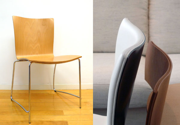 特徴である3次元曲線の脚部フレームには、クロームメッキのΦ12.7mmハイテンションパイプを使用。あくまでも細く、シャープなフォルムと強度を兼ね備えた脚部を実現しました。スタッキング時には、そのラインの美しさがさらに際立ちます。背座のバリエーションは合板タイプとファブリックタイプの2タイプを用意。合板のバリエーションにはビーチ材とチーク材を選ぶことができます。ファブリックタイプは天然木の突き板との組合せにより非常に美しい仕上がりです。