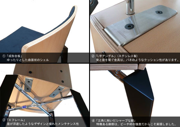 また「CERVO(チェルボ)」のポイントとして ①成形合板 ②L字アングル ③Xフレーム ④三角に削いだシャープな脚 この4点が大きな特徴になります。この特徴とも言えるパーツ化された構造は、メンテナンス性に優れていることで現在でも10年以上前に販売した製品の交換パーツの注文を頂く事があります。