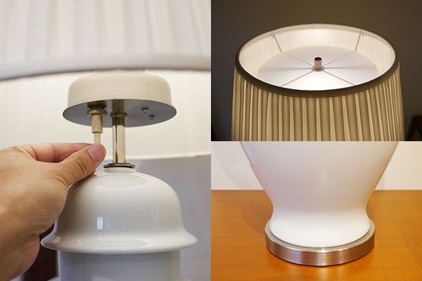 布性のシェードはプレーンの白と黒、クラシカルな白のプリーツタイプがあり、下台と照明機具部にはホワイトブロンズが使われています。照明はシェード下に調光機能付きスイッチが備えられて、光をコントロールする事ができます。白磁器の滑らかさと色合いをお楽しみ下さい。 (クリエイティブ・ディレクター/瀬戸 昇)