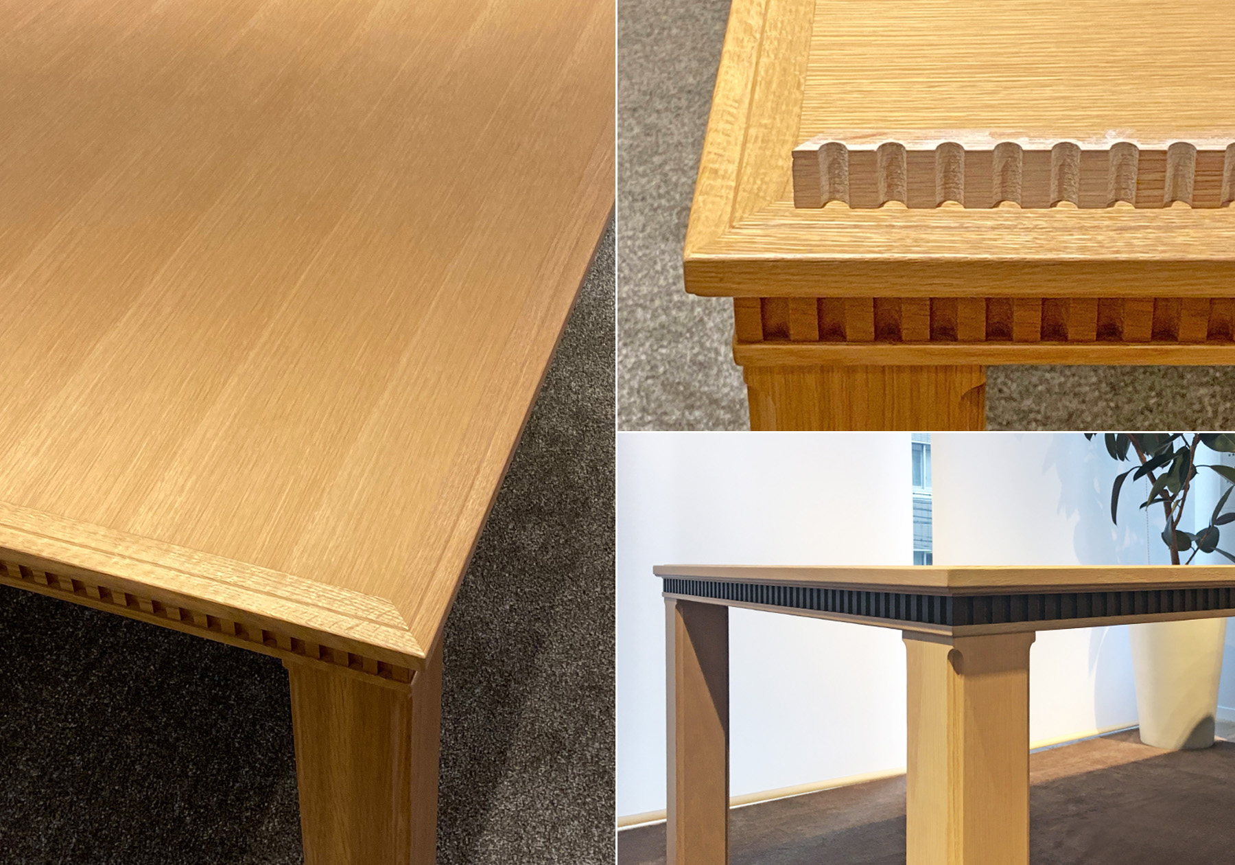 NC-062はW1800、W2100、W2400のサイズバリエーションをご用意しました。奥行は1000mmあり、フォーマルダイニングとしてお使いいただけるサイズとして設計されました。天板は北米産のオークの無垢材を木口に使用し、天板トップはオークの柾目の突板を使用しています。62mmの厚みを持つ天板の木口にはクラシカルな意匠加工を施しています。スリット状に彫り込んだ無垢材の化粧材は、単独で加工を行い木口に埋め込まれているため、天板本体と異なる塗装色もお選びいただけます。交互に現れる陰影がアール・デコ建築を彷彿とさせるデザインです。