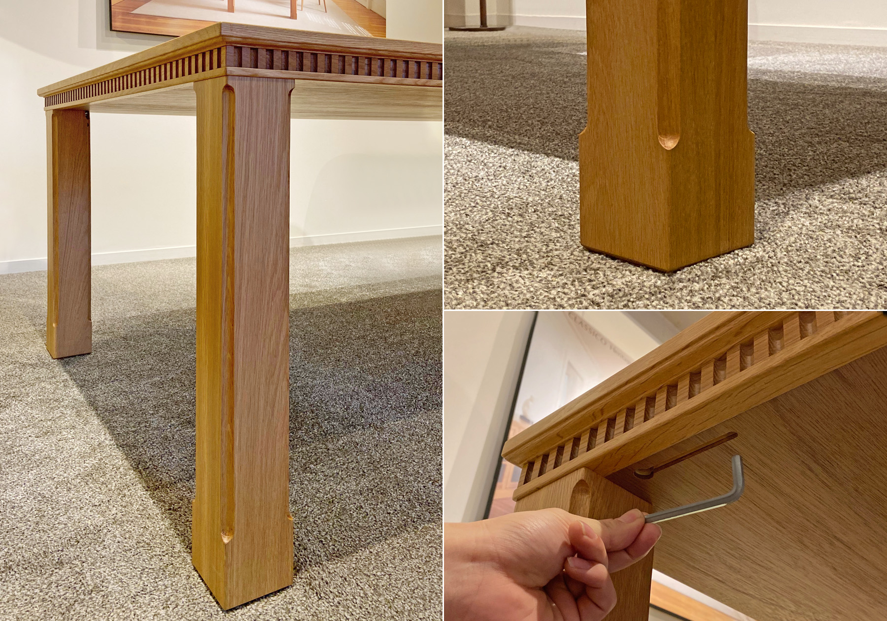 重厚な板厚の天板に合わせる力強い脚部はオーク材でできており、90mm角の太さは柱のような存在感があります。脚の角に部分的に施された彫り込みは、天板の複雑な加工と調和をとるだけでなく、西洋建築の柱のようにテーブル全体に安定感を感じさせます。天板裏には脚を組み立て、増し締めする際に使用する六角レンチをマグネットを使用し収納しています。