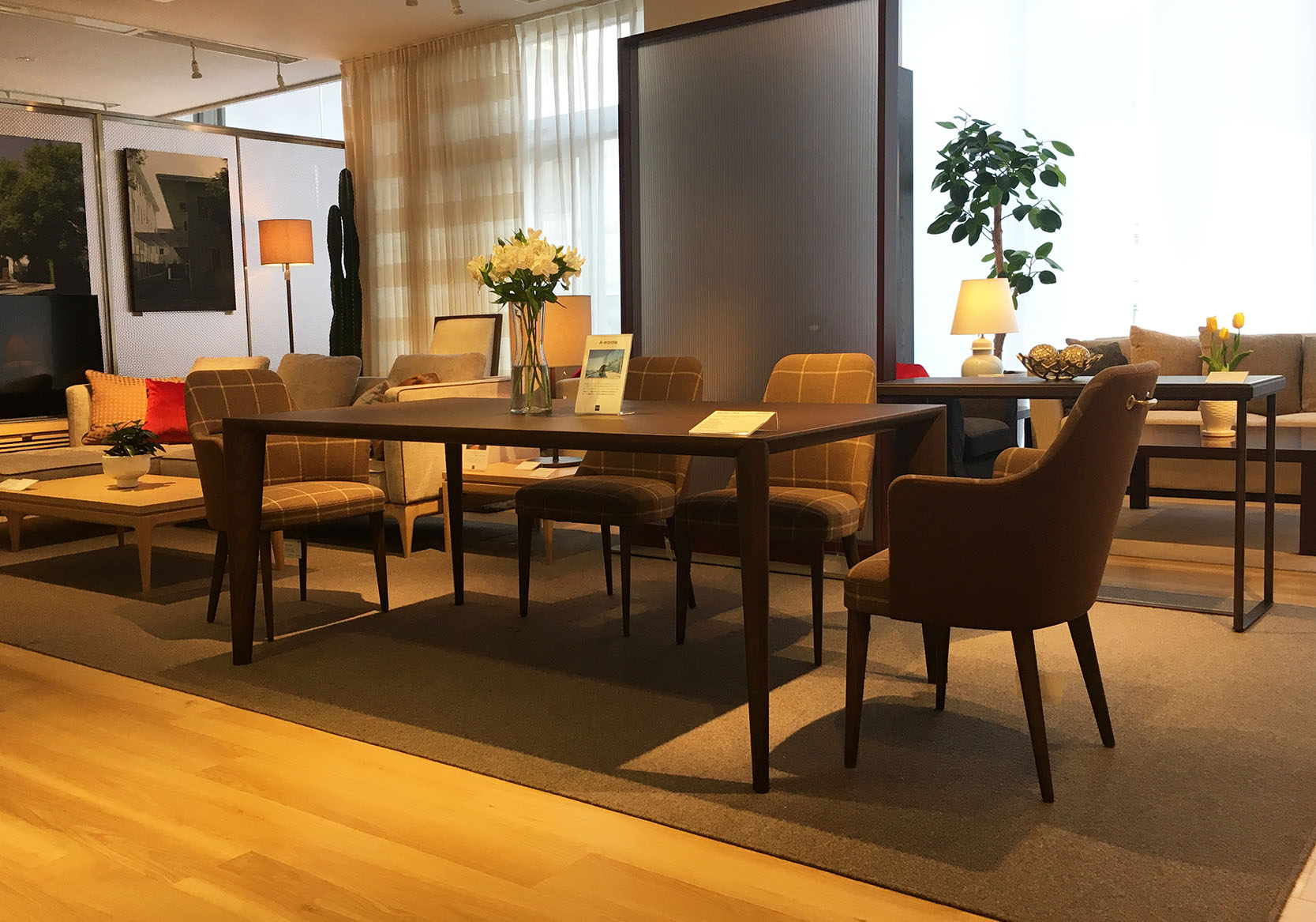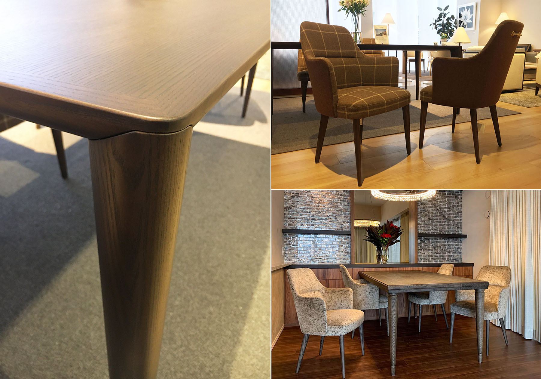 エーディコア・ディバイズ各ショールームに展示している新作のダイニングテーブルMD−905は、楕円形状の脚部とつながるように削り込まれた天板が特徴で、ユニセックスでシンプルなデザインが人気です。大阪・心斎橋ショールームの展示のウォールナットブラウン色を合わせると、お部屋が落ち着きのある雰囲気になります。同シリーズのチェアMD−901の展示品は、座面内側をチェック柄、背裏を無地で張り分けています。チェック柄はカジュアルで温かみのあるイメージで、ウール素材はベーシックで落ち着いた雰囲気になります。納入例のような光沢のあるモケット素材を選べば、ラグジュアリーな雰囲気にコーディネートできます。デザインがシンプルなチェアですので、張地やフレームの色でイメージが変わり、コーディネートの幅も広がります。柔らかなフォルムは、特に女性から人気があります。見た目だけでなく座り心地も快適で、背の切り替えは背中から腰のカーブに沿うようにフィットします。お座りいただいたお客様から、「気持ちが良い」と高評価をいただいています。楕円の脚はミニマムなフォルムで抜け感もあります。実際にショールームにお越しいただき、実物をお確かめください。