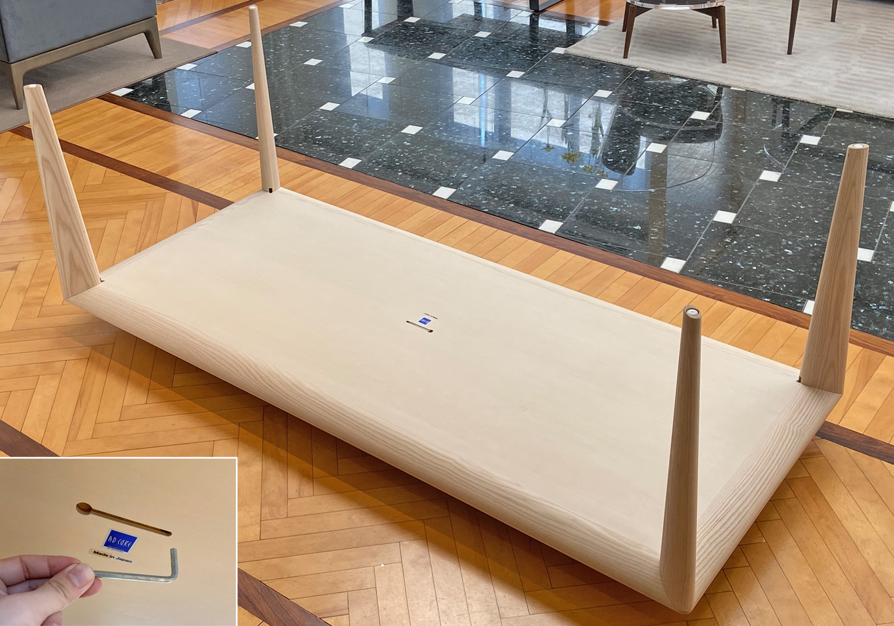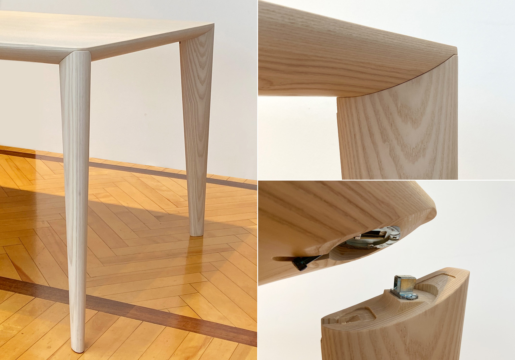 脚部はホワイトアッシュの無垢材を使用し、正楕円形状のまま脚先までテーパー状に削り出しました。無垢材の力強さと軽やかさを併せ持った、見る角度により立ち姿を大きく変えるデザインです。脚部はノックダウン方式を採用しながら金物が見えないようにするため、天板とのジョイント部分もデザインしました。ジョイント部分は楕円の脚部とカーブを描く天板木口が接合するため、三次曲面を精巧に削り出す加工を行なっています。シンプルな造形を作り出すため、目に見えないディティールまでデザインされたテーブルです。