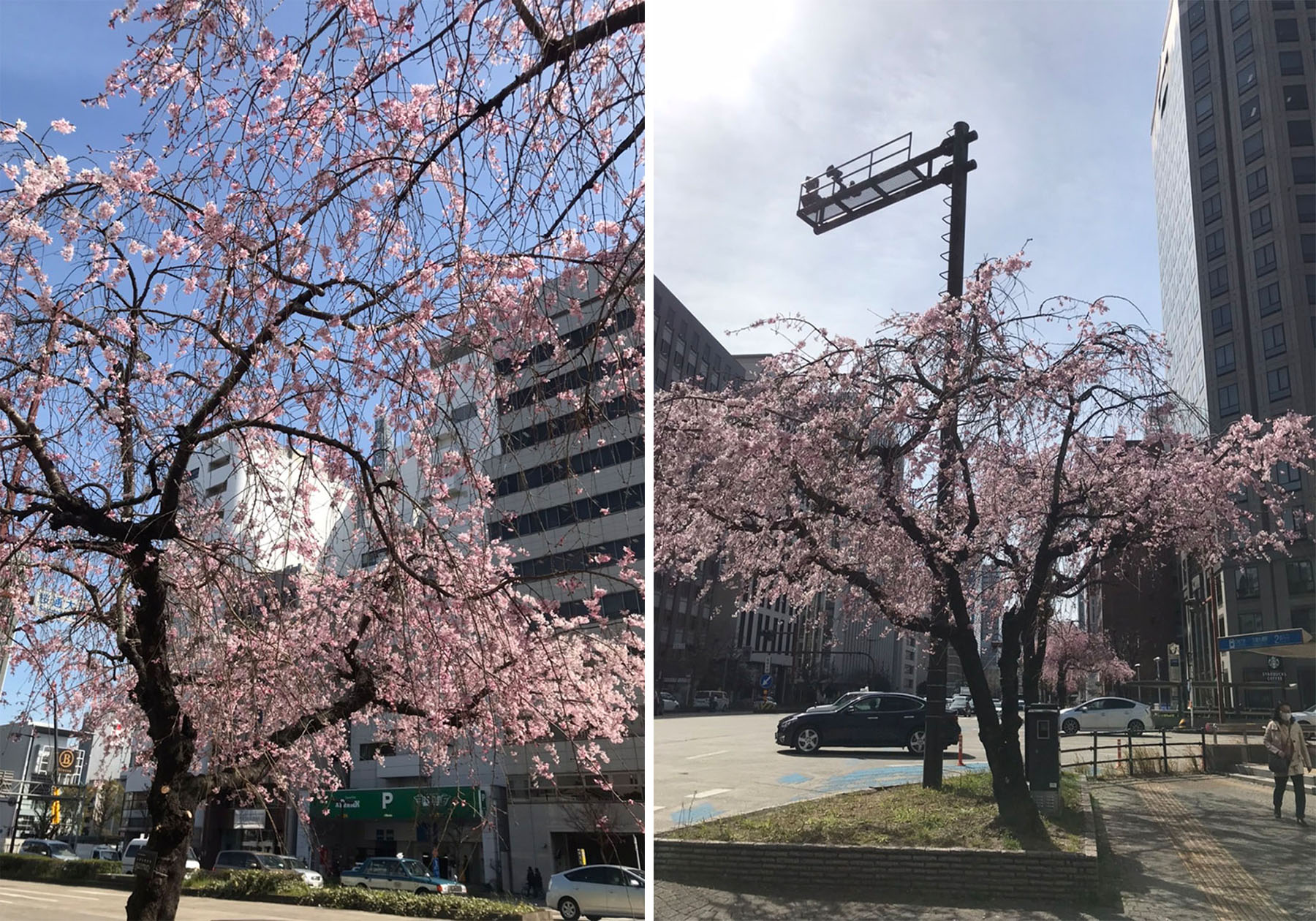 昨日までの名古屋市は、朝晩は冷え込む日もありましたが、日中は気温も上がり春らしい陽気が続いていました。その甲斐あって久屋大通のシダレザクラはほぼ満開で、晴天のブルーに淡いピンクの桜の花色がとても映え、圧巻の美しさでした。来週半ば頃までは雨が続く予報です。せっかく開花した桜が散ってしまうのでは、と少し心配ではありますが、満開の桜を少しでも長く楽しみたいものです。今年は新型コロナウイルス感染拡大を防ぐために、集団での宴会を控えるよう呼びかけられており、この時期ならではの“風物詩”が見られないのは少し物足りないですが、桜は例年通り満開の花を咲かせてくれます。日本の四季を味わう意味でも今年の“桜”を存分に楽しみたいと思います。名古屋ショールームでも、桜を飾り春の雰囲気を演出しています。ショールームの桜は開花し、一気に春らしくなりました。本来なら桜が散る頃が見頃となるシャクナゲも暖かいショールームでは既に花を咲かせております。