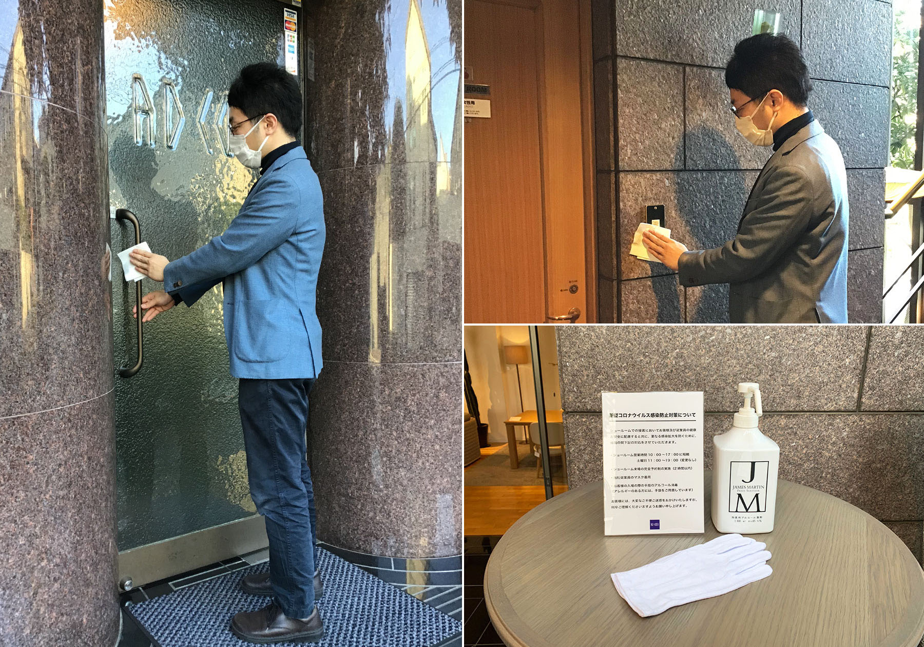 ・定期的な社内消毒:玄関ドア、トイレのドアノブ、スイッチ類、打合せ使用家具の消毒