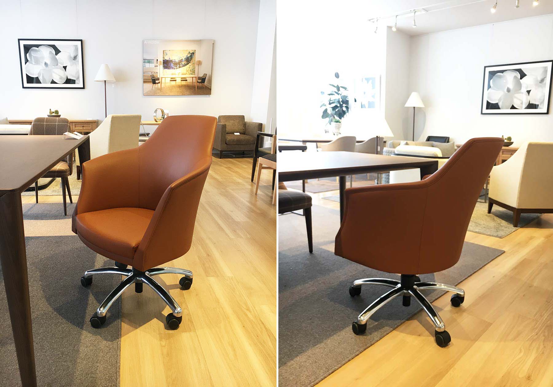 エーディコア・ディバイズでは、上質なオフィスチェアを多数揃えています。在宅勤務中に多くの人は1日8時間程度チェアに座るといわれており、仕事の効率アップを目指すなら、まずは働く環境を見直すという方が増えています。大阪・心斎橋ショールームには、NEO CLASSICOのキャスター付きエグゼクティブチェア015-MODELを展示しています。こちらのチェアは、落ち着きのあるデザインと上質な質感を感じていただけるチェアです。高級感を出しつつシンプルで飽きのこないデザインは永く使っていただけます。座面にはダイメトロールを使用し、木製フレームの中にウレタンが入っており、見た目だけでなく座り心地も追求した逸品です。お客様からは、「張りがあるのに程よく柔らかい」「腰を包み込むような快適な座り心地」と好評をいただいています。長時間のパソコン作業でも筋肉が固まったり、腰を痛める心配が少なく仕事に集中ができます。更に、疲れにくさを追求するならハイバックタイプがお勧めです。身体を預けられる面積が広いほどくつろぎやすく、疲れが溜まりにくいと言われています。また座面の高さとリクライニングの調整が可能ですので、ラウンジチェアとしてもお使いいただけます。展示品は革張りですが、抗菌や防カビ、防臭、防汚、撥水などに対応したファブリックもご用意しております。