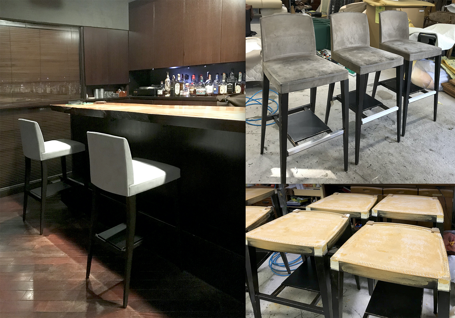 ホームユースでは自宅で過ごす時間が長かったため、椅子やソファの張替えを検討する方が増えたのですが、商業施設や飲食店などでも自粛休業中に普段ではなかなかできない椅子やソファの張替えのお問い合わせをいくつもいただきました。今回お話をいただいたお客様は、渋谷駅から徒歩数分の道玄坂にある大人のシガーバー「 IRIE 」さま。入り口の扉は栃の木、無垢材の温もりを最大限に活かしたミズメ材のカウンターの前にAD-023 ルッソカウンターチェアがセットされている上質な大人の空間のお店です。15年に渡り当社の製品を使っていただいていたのですが、今回椅子の入れ替えもしくは張替えのお問い合わせをいただきました。椅子の状態を確認し、予算も検討いただいて張替えの対応となりました。