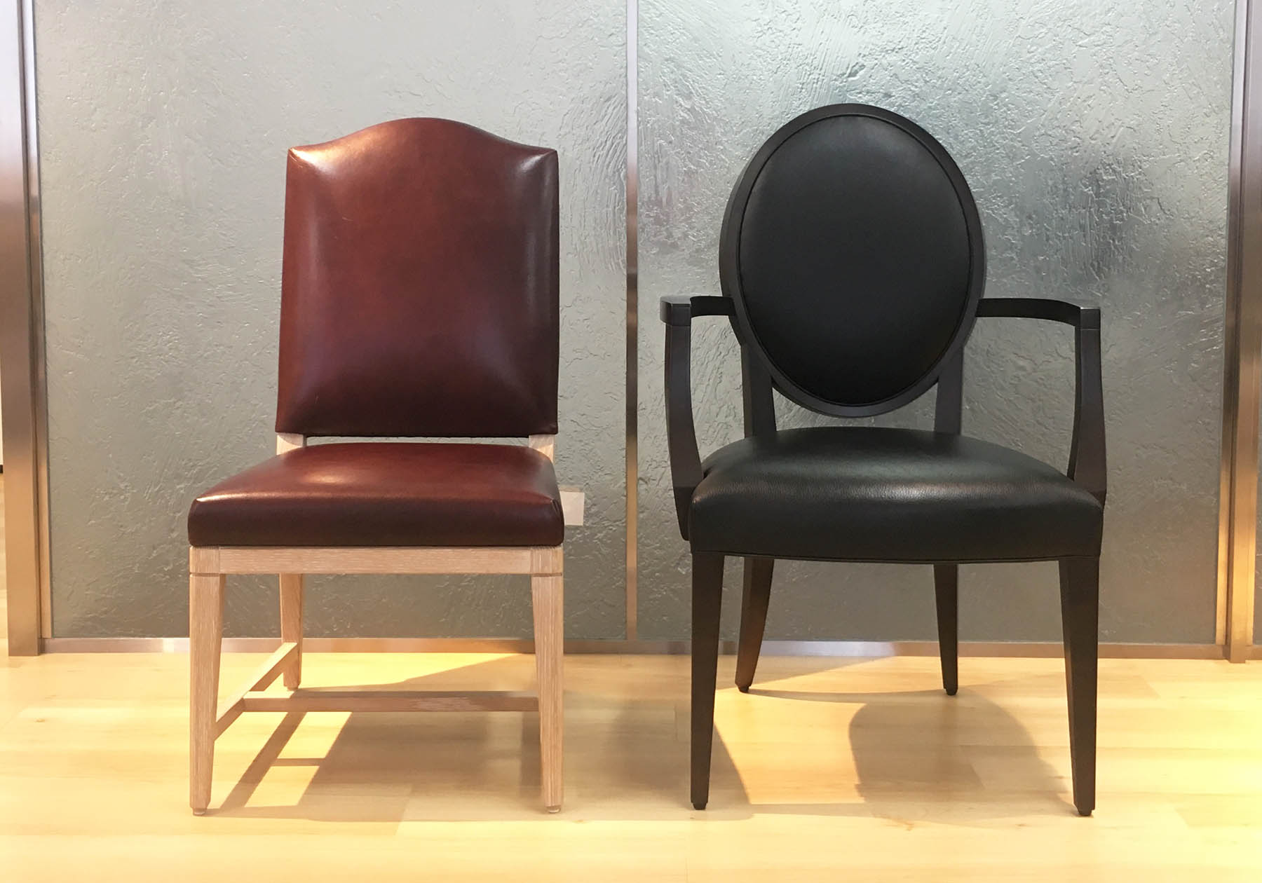 永くお使いいただくために、張地は天然皮革をお勧めしています。ファブリックの様々な表情やテクスチャーも魅力的ですが、天然皮革は耐久性に優れ、お手入れも比較的簡単です。本革の中でも汚れやメンテナンス性を重視する場合、天然皮革用の撥水、撥油加工を施したプロテクトレザーがお勧めです。革の表面に加工しているのではなく、鞣しの段階から加工しているので、家具を使っているうちに加工が剥がれる心配もなく、持続性があります。革の風合いを楽しむのであれば、ヴィンテージレザーがお勧めです。自然な色ムラやシワがあり、使っていくうちに革特有の味わいが出てきます。経年変化を楽しんでいただけるのが醍醐味です。傷に強い革をお探しの場合、ウレタン仕上げのものがお勧めです。特にゼブレザーやソフトレザーはシボの型押しをして仕上げているので、万が一傷がついても目立ちにくいです。革にも特徴がありますので、用途によって選ばれてはいかがでしょうか。