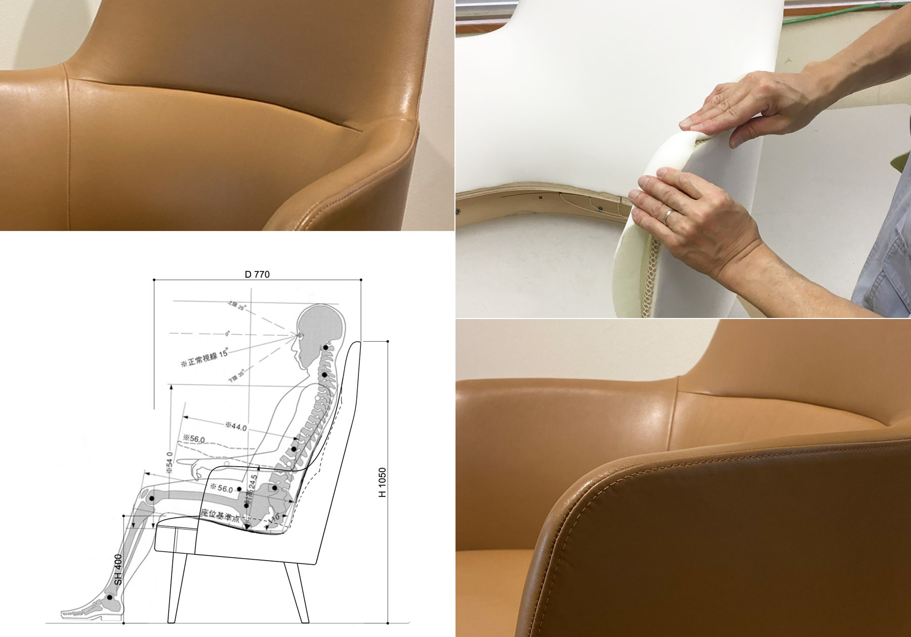 MD-901Lはステッチのラインやウレタンの貼り方などディティールまでしっかりとデザインすることで、柔らかなラインとシャープなエッジを両立しています。様々なファブリックと相性の良いニュートラルなデザインのMD-901Lはご自宅やマンションのエントランス、応接室などでお使いいただいています。