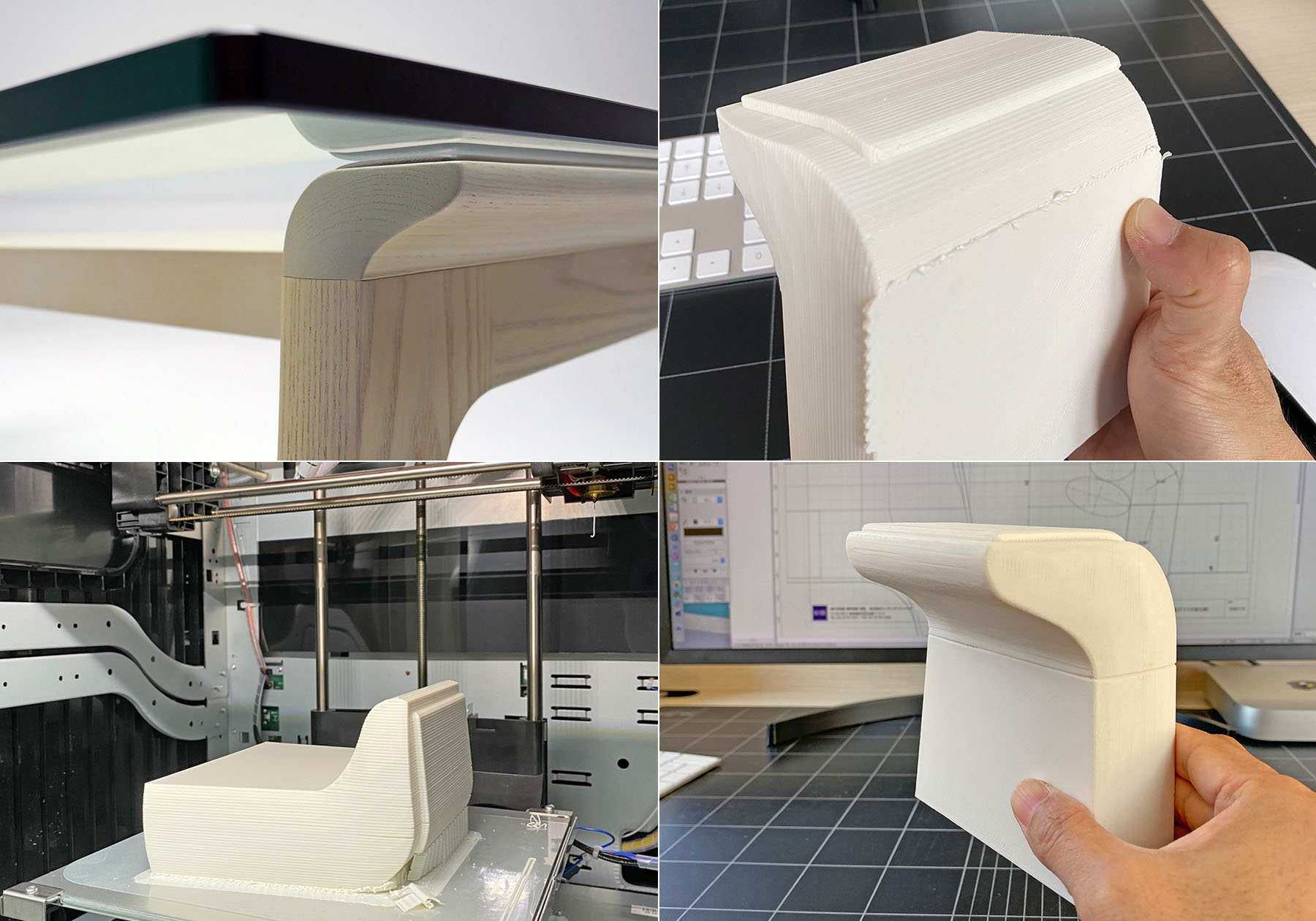 以前は、模型は木材や発泡材を削り、成型合板ならボール紙を重ねて圧着して、本物に近いイメージで模型作りを進めて、途中でデザイン変更などしながら模型を完成していました。3Dプリンターでは、ABS樹脂などの棒状のフィラメントを溶かして積層させ形を作ります。樹脂なので硬くて後からは削りにくいので、データを最初からしっかり作る事が必要となります。形状がリアルに出るので、イメージを確認するには便利な機械です。時間的に3Dプリンターだから早くできるという訳ではなく、どちらも数日かかります。以前は模型の削り粉にまみれて作っていましたが、今ではトミーがデータを作ってくれて、3Dプリンターが忙しく動いてくれるだけので助かるのですが、、。