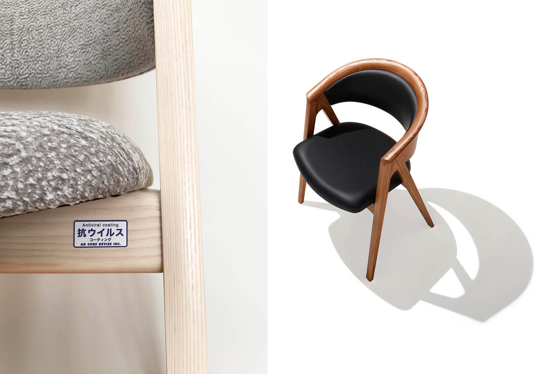 エーディコア・ディバイズでは、新型コロナウイルス感染が広まりつつあった3月には抗菌塗装仕様を取り入れ、安心して家具をお使いいただけるよう早急な対策を取りました。そしてその時期すでに「抗ウイルス資材」の開発を各工場と進めていました。抗菌と抗ウイルスでは、同じような感染防止策のように取られることもありますが、内容は大きく異なります。菌は目視が可能で個人でも試験をすることが可能ですが、ウイルスは国内でも限られた施設でした扱うことができず、認証試験も長い期間が必要となります。私たちはいち早く開発を進めて今回の新製品に間に合わせることができましたが、現在は試験を受けるのに1年以上待たなくてはならない状況のようです。抗ウイルス仕様の開発は、木部の抗ウィルス塗料、天然皮革の抗ウイルスレザー、張り地にコーティングする抗ウイルス加工の3アイテムを企画し準備を進めました。