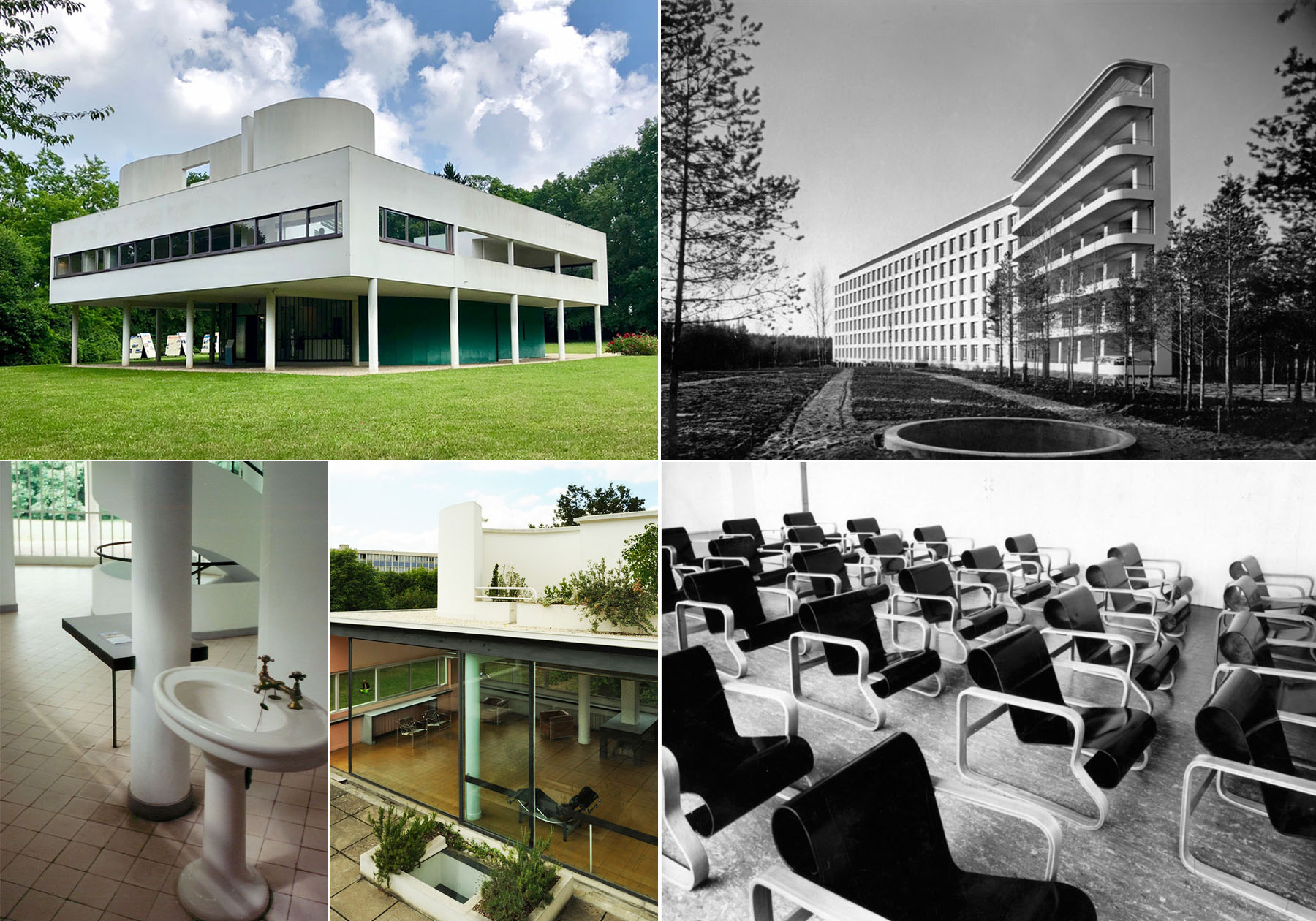 20世紀初頭に生まれたモダニズム建築は感染症の中で生まれたと言われています。当時、世界的に大流行していたを結核を治療するために、多く作られたサナトリウムでは白い清潔な空間に換気をするための大きな窓、埃がたまりにくく消毒のしやすいシンプルな空間にし、そこに置かれる家具は、座と背が開いていて埃がたまらず、革や合板で拭きやすく、足は足元からの感染を防ぐために、ステンレスやクロームメッキの金属が使われました。フィンランドのアルバー·アアルトがデザインした整形合板のパイミオチェアーはサナトリウムのために作られました。当時の新鋭建築家、ル·コルビジェ、ミース·ファン·デル·ローエ、アルヴァ·アアルトらが進めた建築はその他のモダニズム建築に影響を与えました。