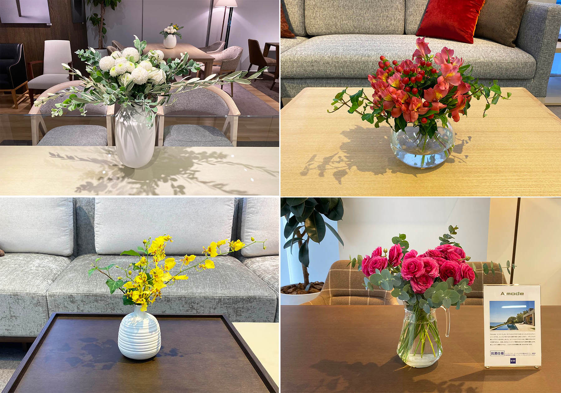 現在、ショールームのディスプレイにはニューモデルのテーマをイメージして、ピンポンマムを合わせています。丸いフォルムが可愛らしく、見る人の心を癒します。マムは日持ちし、手がかからないのでご家庭で飾っていただくにもお勧めです。また、新製品のシステムソファMD-1105も展示しています。豊富なサイズバリエーションでレイアウトを自由自在に組め、ベンチにはオプショントレイを合わせてセンターテーブルや、サイドテーブル、またオットマンとしてもお使いいただける多様性のあるソファです。こちらにはオンシジウムを飾りました。蝶に似た花びらはそのまま飾ると平凡なアレンジになりますので、1本を長く残し、他は短く切り分けて散らしリズム感を出したアレンジにしました。温かみのあるカラーのクッションを合わせて冬のコーディネートの完成です。