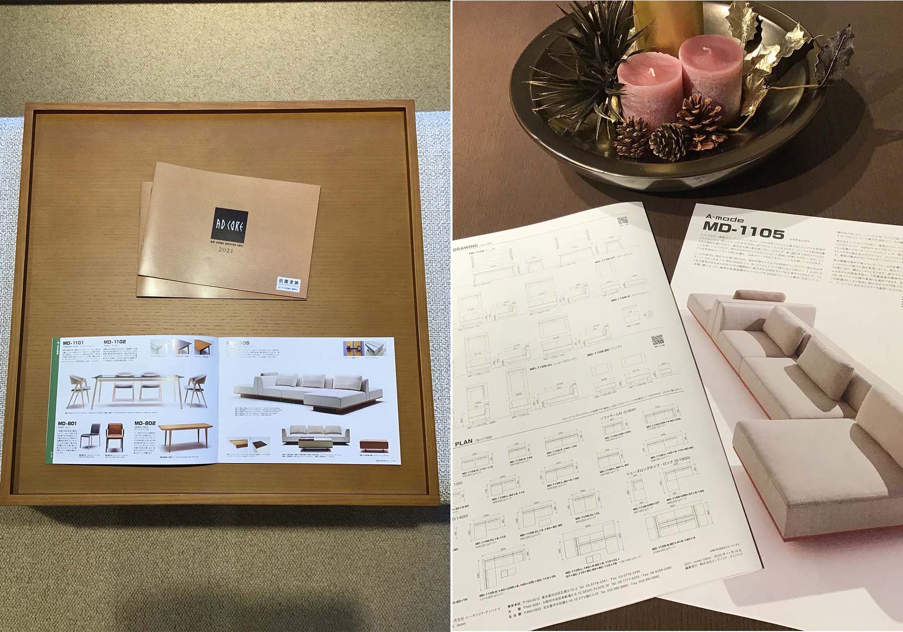 これらの新作商品を掲載したミニカタログも発行しました。巻頭に新作のダイニングセットとシステムソファ、そしてラウンジチェアMD−901Lとセットでご使用いただけるオットマンもMD−901Lのページに追加掲載しております。ミニカタログには新作だけでなく当社で人気の売れ筋商品がシリーズ毎に掲載され、インテリアのテイストやお好みに合わせて選びやすい構成になっています。また後半には納入例も掲載されていますので、イメージもし易く、打合せで全体の雰囲気をお伝えするのにも役立ちます。また巻末にはマテリアルも掲載されていますので、仕様のご検討もこの一冊で可能です。外出先での急なお打合わせや、詳細を確認していただく際にもHPを開いていただくよりも早く確認いただけます。インテリアのイメージがまだ漠然とされているお客様も事前にご覧いただき、お好きなテイストを絞っていただくツールとしても是非活用ください。とてもコンパクトな一冊ですが、必要な情報が凝縮された充実した内容となっていますので、常に携帯いただきたい一冊です。ショールームまでお越しいただくことが難しいお客様や、ご来店を躊躇されているお客様には、このミニカタログ からおも充分に商品の良さを感じていただける内容となっています。ご自宅で過ごす時間が長くなった昨今「お家時間」にゆったりとご覧いただき、ご自宅で家具選びなどいかがでしょうか。ご希望のお客様はどうぞショールームまでお問い合わせください。