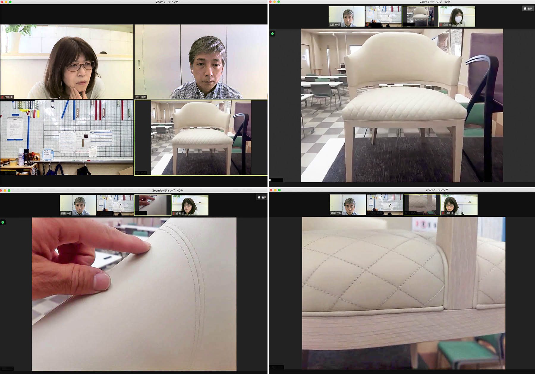 エーディコア・ディバイズでは、アイテムの特徴により製品に適した工場に生産を依頼しています。木加工に特化した工場、張りが得意なところ、金属加工だけをお願いしている会社もあります。長年のお付き合いがあり定期的に訪問している工場ですが、移動自粛によりお伺いできない状況が今も続いています。昨年は新製品の開発でもZoomを使ったリモートミーティングを行いましたが、現在は製品チェックをZoomミーティングで行っています。複数の参加者が共通の資料やモニターを共有したり発言を行えるメリットを生かしての打ち合わせです。工場内での現場、設計室、東京の事務所など、各所から一同に参加できるので非常に効率的。スマートフォンで参加すれば移動カメラとしてのミーティング参加も可能になります。今は自粛制限で出来なくなっている「お客様による製品の工場検査」も、オンラインで開催できます。今までは出張の時間やコストを掛けて行なっていた工場検査も、オンラインなら効率的に実施が可能です。