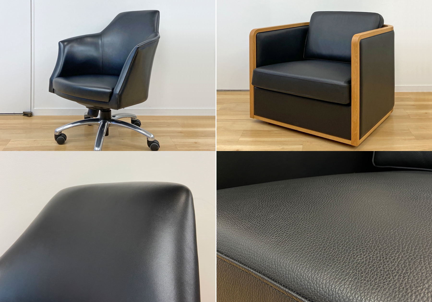 先日ショールームに革の製造メーカーの方が打合せに来られ、ショールームのエグゼクティブチェアーに張られている革のスムースレザーを見て「本当に良い革を使ってますね」と感心していました。スーパーブランドの財布やカバンのように、シボが均一に入った表面が本当の革と思われがちですが、本当の革は表面が薄化粧で、表面が平滑で傷が少ない物が良い革とされています。当社のスムースレザーも革本来の、血筋や自然なシワが見えやすく、下地自体がスムーズで綺麗な革が必要になり、傷の少ない2年以内の革を使用しています。スムースな表面のために少し滑りやすく、塗装も薄いので表面もデリケートです。展示のエグゼクティブチェアーもよく見ると血筋やシワなど自然な風合いがあり、経年変化も楽しめる事から革好きの方には好まれています。
