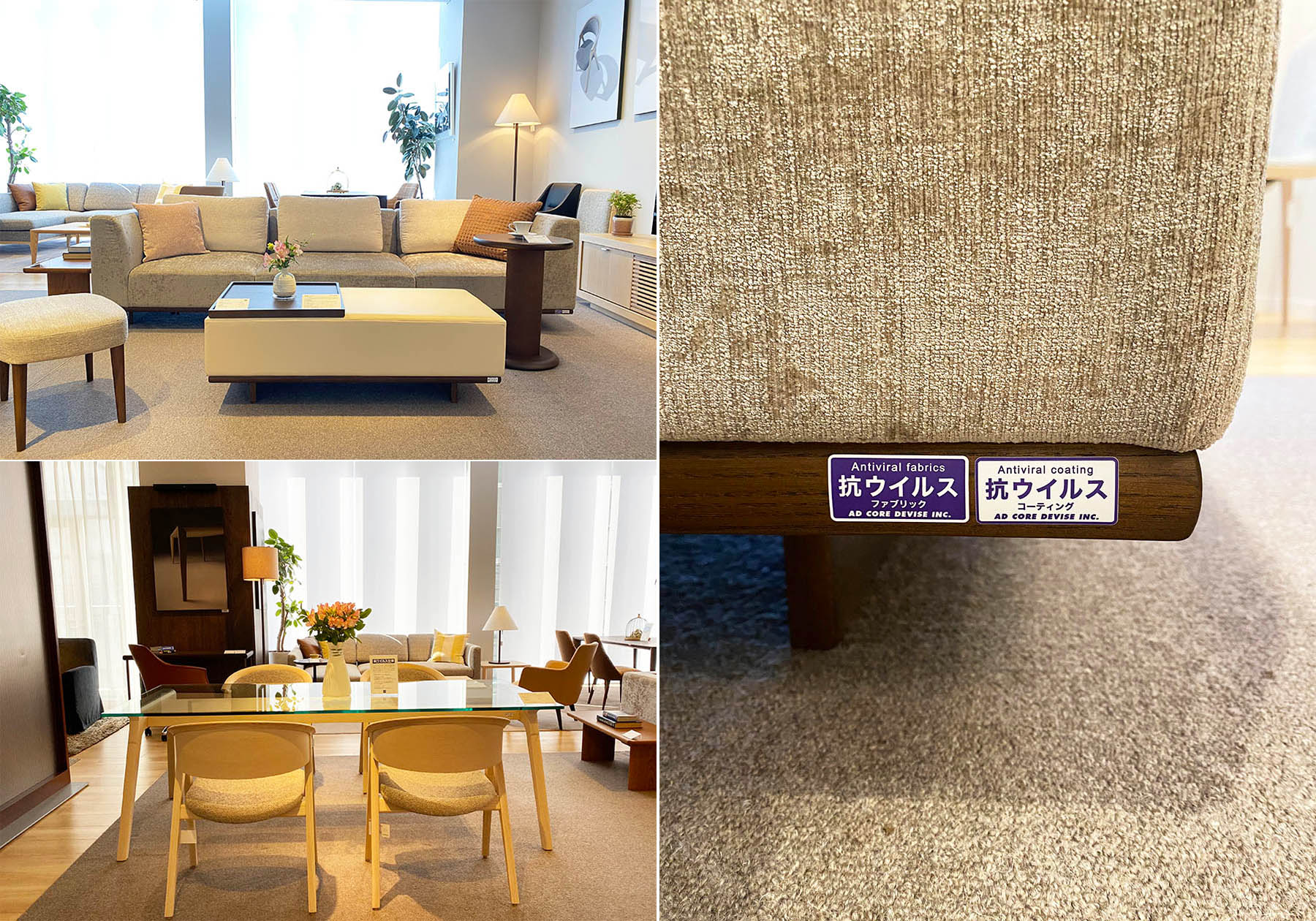 手洗い、消毒をこまめにするようになり、直接触れる全ての物の安全性が気になるようになりました。現在エーディコア・ディバイズでは、感染防止対策として抗ウイルス仕様無料キャンペーンを実施しています。当社では昨年より全ての木製品は抗菌塗装を標準化としていますが、さらに安心してお使いいただけるよう抗ウイルス仕様の木製塗装と抗ウイルスファブリックコーティングをオプションとしてご用意しています。大阪・心斎橋ショールームでは、A-modeシリーズの新作ソファセットMD-1105と、ダイニングセットMD-1101A、MD-1102に抗ウイルス塗装とファブリック抗ウイルスコーディングを施した製品を展示しています。抗ウイルス仕様にしても、見た目や手触りは全く変わりませんのでお好きなカラー、張地をお選びください。ご自宅用はもちろんホテルやレストラン、オフィスなど不特定多数の方がお使いになる場所でもより安心してご利用いただけます。
