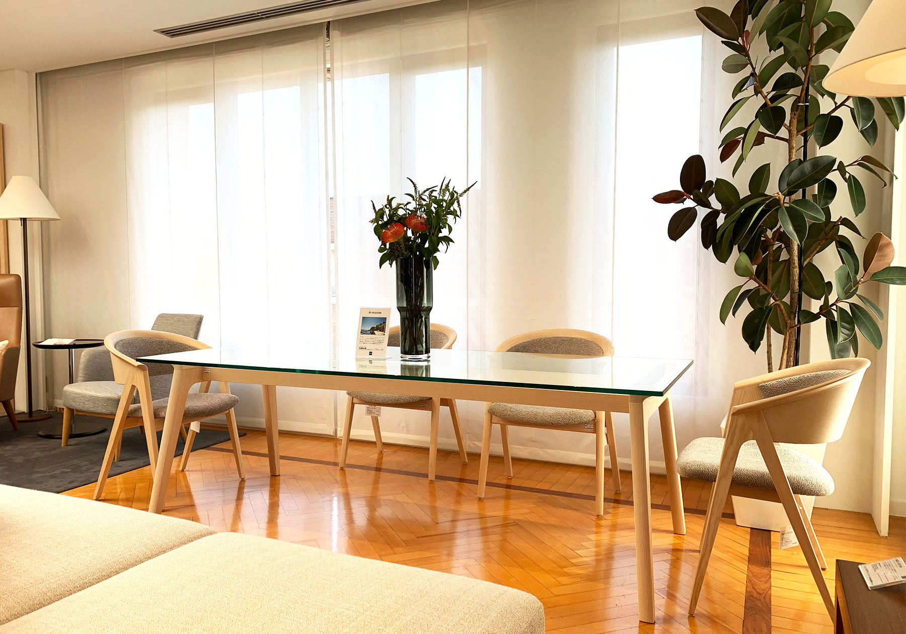 抗ウイルス仕様の中でもお客様から一番ご要望が多いのは、ダイニングテーブルです。ダイニングテーブルは食事をするだけでなく、お子様が勉強したりリモートワークで仕事をしたりと用途は多様化していますので、抗ウイルス塗装をすることで、より安心して清潔にお使いいただくことが出来ます。抗ウイルス塗装にすることによって、日常のお手入れの際に次亜塩素酸(200ppm以下)やアルコール(エタノール60%以下)をお使いいただいても、表面のウレタン被膜を溶かすことなく家具を傷つけません。また、抗ウイルス銀系薬剤が成分を溶出することなく効果を発揮し続けますので、長く安心してお使いいただけます。更に、規格張地として安全性の高い抗ウイルス天然皮革とファブリック・抗ウイルスコーティングもご用意しております。椅子やソファは使用する際に人の肌に一番近い部分です。人が触れる場所は菌やウイルスの付着が懸念されますが、抗ウイルスコーティングを施すことにより安心してお使いいただけるようになります。特殊なコーティング剤を使用することにより、通常洗濯は50回程度、ドライクリーニングは3回の施工でも効果は持続します。