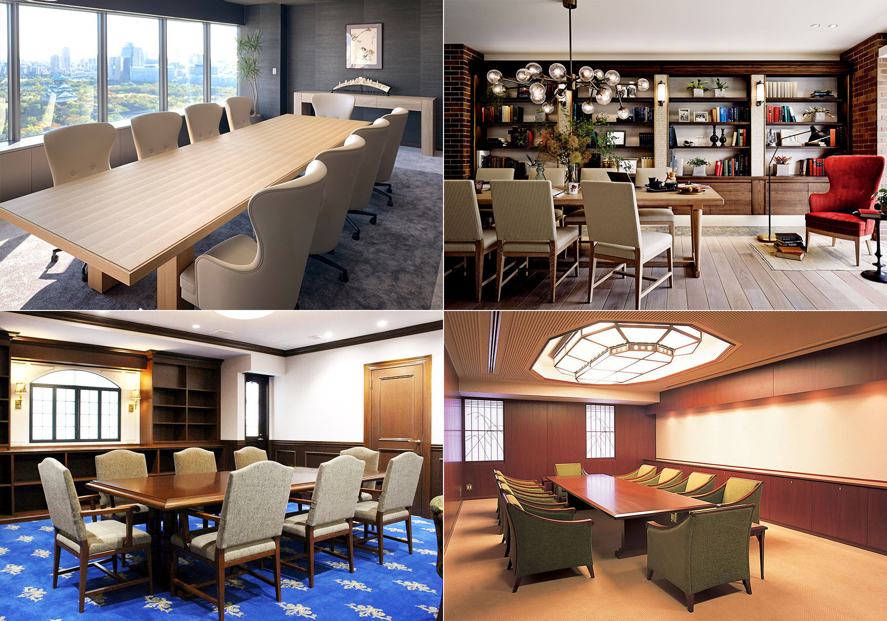 私たちの生活には欠かせない様々な用途のテーブル。ホームユースの主役的なアイテムでもあるダイニングテーブルですが、オフィスやコンベンションホールなどで利用される会議用などの大型テーブルもインテリア空間にとって最も重要なアイテムです。テーブルのサイズは、突き板合板やプレス機械の大きさが基準となっていて、通常は4x8サイズと言われるW2400xD1200が最大の大きさになります。しかし、当社では一般的なサイズを大きく超えるテーブルのご要望をたくさんいただきます。リビングスペースが大きい物件が増えてきたことや、企業のオフィスや重役室などにお納めする会議用等の大テーブルの需要が増えているためです。当社では、5mを超える大型のテーブルや、1枚もので3mを超える天板を製作するなど、大型のテーブルの製作を多数行っています。