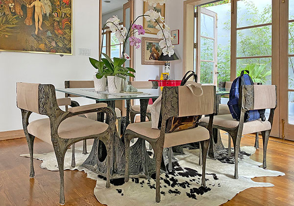 YASUKOさんの家にあるブロンズ彫刻の脚を持ったテーブルと椅子のダイニングセットは貴重で、特に天板のオリジナルガラスが残っている物は貴重品です。先日、アメリカのアート販売サイトでポール・エヴァンスのダイニングセットが販売されていて、YASUKOさんの家のダイニングセットと同じ数のセットで13万ドルの価格が付けられていました。13万ドルといえば2,000万円近い金額です!YASUKOさんに聞くと30年前にニュージャージー州のオークションで$4,500(675,000円)で購入、$500で運んでもらったそうです。30年経ち30倍近い価値になるなんて驚きです。今、自宅にある家具やアートはインターネットオークション以前のオークション会場で購入した物ばかりだという事で、フォルナセッティのオリジナルキャビネットもあります。本当に昔から確かな審美眼を持っていた事に驚かされます。投資目的で手に入れた訳でなく、自分の好きなインテリアにするために購入した物が時間を経て価値が上がっている事こそ本当の審美眼なんでしょうね。