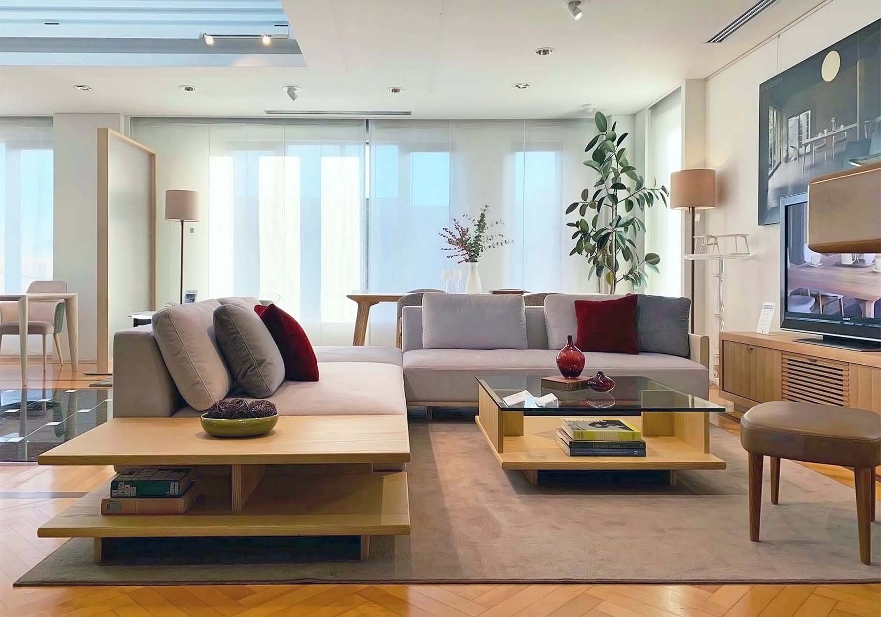 また、図面を見ながら搬入経路も考慮し、理想のお部屋づくりのご提案もいたします。当社のソファの中でもA-modeシリーズのMD-1105システムソファやMD-805ソファは、アームや背を外せる構造になっておりますので比較的狭い搬入経路でも搬入が可能です。人気のソファMD-210シリーズはコンパクトなサイズ感ですが、シェーズロングスタイルの組み合わせも可能です。