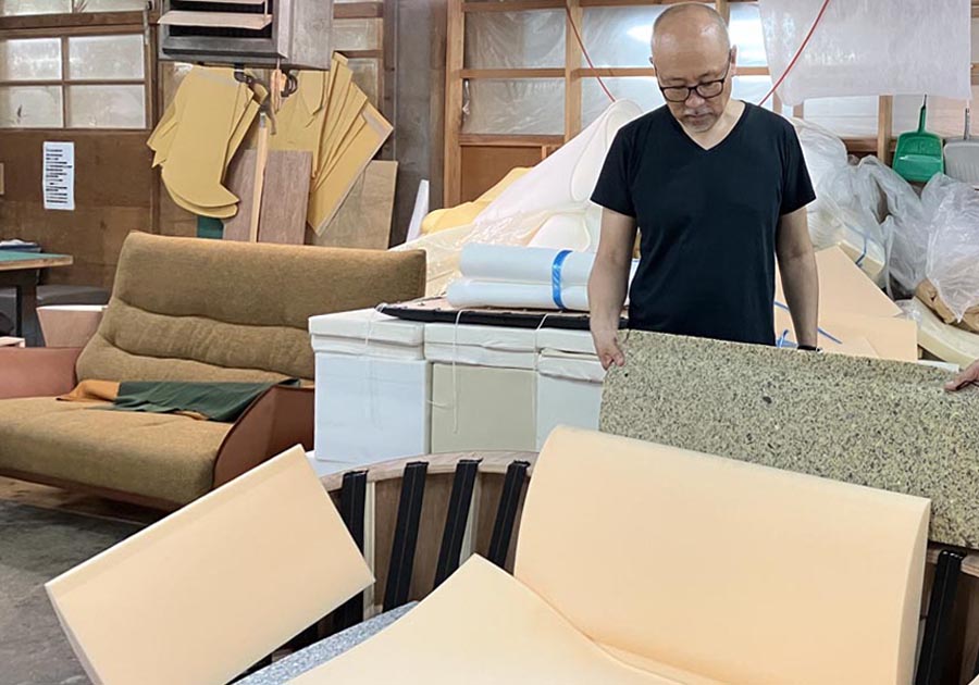 当社製品は国内生産の木製家具がメインで、椅子やテーブルの表面材はアッシュ材やオーク材、メープル材など北米やヨーロッパから輸入された材を使用しています。表面材は森林循環型の証明がある材料を使用していますが、見えない中に使われている材についての産地などは無関心だったと思います。特にソファやラウンジチェアのような大きな製品はファブリックで覆われた中に、椅子の数倍の木材料や石油由来のクッション材が使われていて、お客様からは中に何が使われているか分からなくなっています。ソファの中にはラワン合板や強度が必要な箇所には安価な南洋材が使用され、容積のほとんどを占めるクッション材には石油由来の発泡ウレタンフォームが使用されています。南洋材やラワン合板は東南アジアで伐採され5,000キロ以上海上輸送されて日本へ届けられています。森林伐採も危惧されますが、輸送距離の長さから二酸化炭素排出量が多い材料になっています。