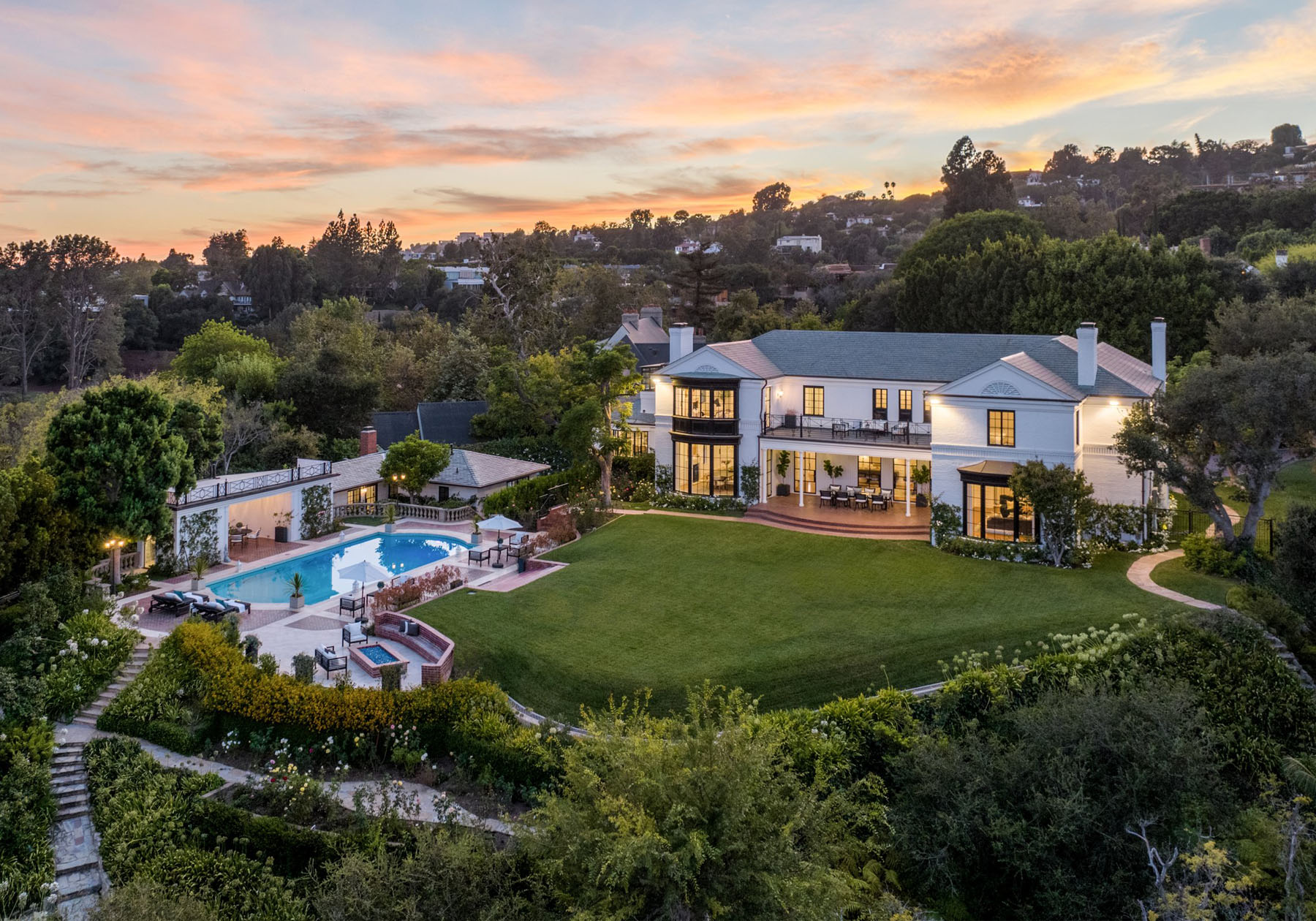 次の家は隣にある2022年新築のモダンハウス、7ベッドルームの11バスルームで4250万ドル、約55億円。建築家ゾルタン・パリの設計によって2022年に建てられてました。1,565平方メートル(474坪)の床面積の家で土地は1,045坪です。建物の単価は1平米352万円です。ブロンズパネルが使われた外壁の建物を入り、資料見ながら、先ほどの家の土地面積が2,387坪なので半分以下なのに価格は1.2倍とは土地の金額は住宅の価格に影響は無いのかなと不思議に思いリビングに進みました。フレンチウォールナットの優しいブラウン色のフローリングが使用された部屋が続き、モダン家具が並ぶ広い部屋はどこからでも光が入る明るい空間で、カノンが流れる空間を体が浮遊するように進みました。インフィニティープールはもちろん、地下のメディアルームまで手抜きの無い作り込みです。なんとなく、和の印象を受ける部屋の作りは今のアッパー層の和に対する認識の高さへ働きかける手法かなとも思いました。