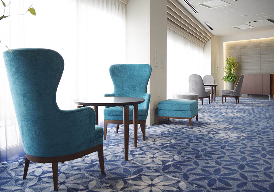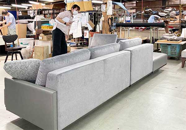 夏は、ブルー系をテーマカラーにディスプレイをしています。それぞれのブランドイメージに合わせて、ディスプレイにも変化をつけています。A-modeはガラスの花器に爽やかな枝物を飾りナチュラルモダンな雰囲気に。AD COREは、ガラスとシャープな植物の葉やストーン、エアプランツを使い、モダンでクールな印象にしています。A-mode Heritageには落ち着いたグレイッシュなブルーをプラスし、リラックスしてお茶を飲んで頂けるように落ち着いた空間を意識しました。エアプランツや観葉植物が、涼しげな雰囲気を醸し出しています。お花や植物がお好きなお客様には「どちらのお花ですか」「綺麗ですね」などと言って頂けたり、家具と一緒に写真を撮って頂けたりするので、ディスプレイにも気合いが入ります。