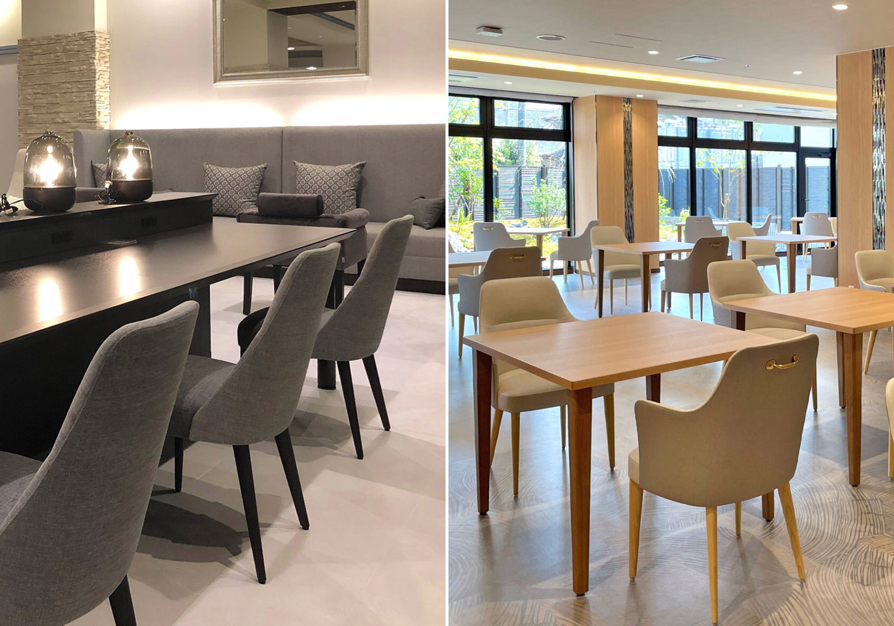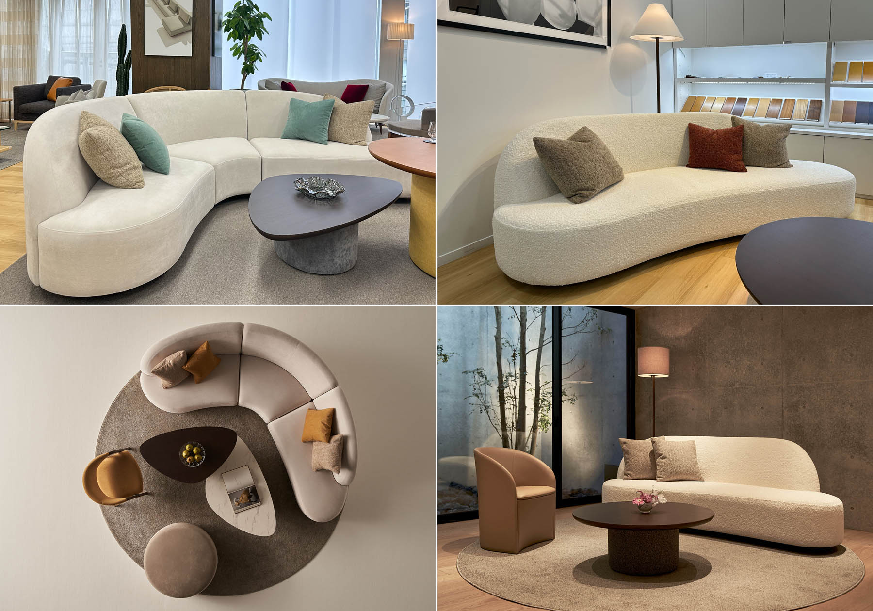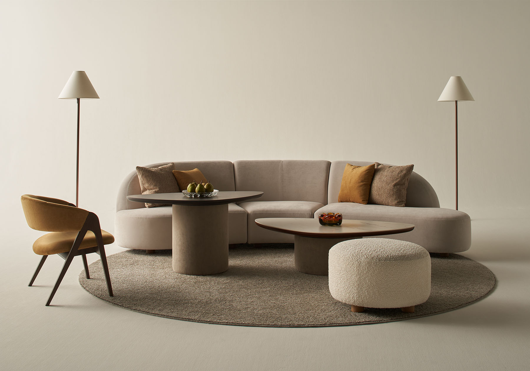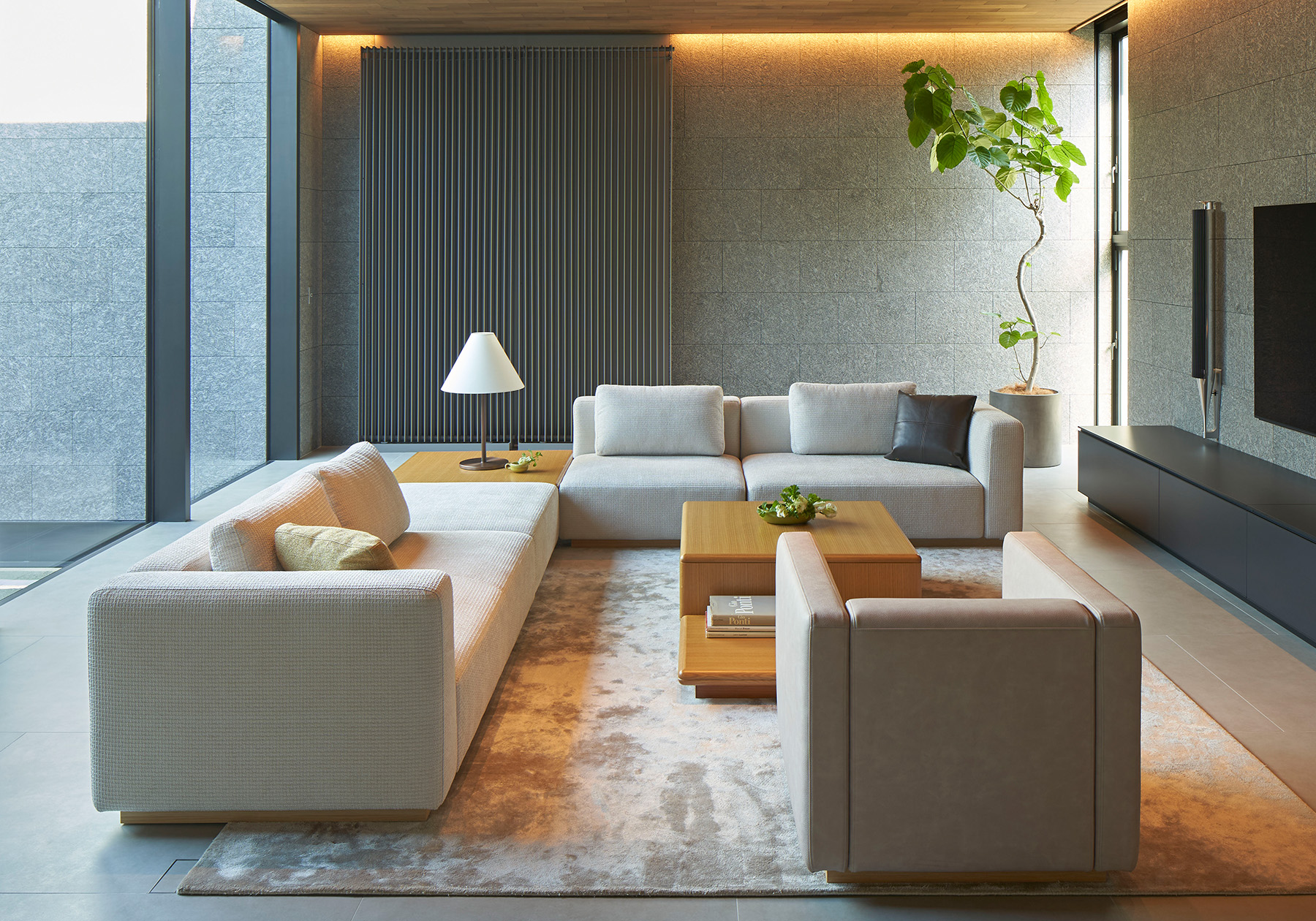 エーディコア・ディバイズのシステムソファでは、ボリューム感のあるMASSAⅡやカーブを描いたレイアウトが可能な075-MODELが人気です。MASSAⅡは背とアームが同じモジュールですので、自由なレイアウトも可能ですし、単体としての使い方もできますので、自由な発想で組み合わせが可能です。また、075-MODELは流れるような有機的なフォルムが特徴的です。壁付けではなく空間の中央にソファを置く場合などにお勧めです。左右非対称なフォルムが空間に柔らかさを与えてくれます。