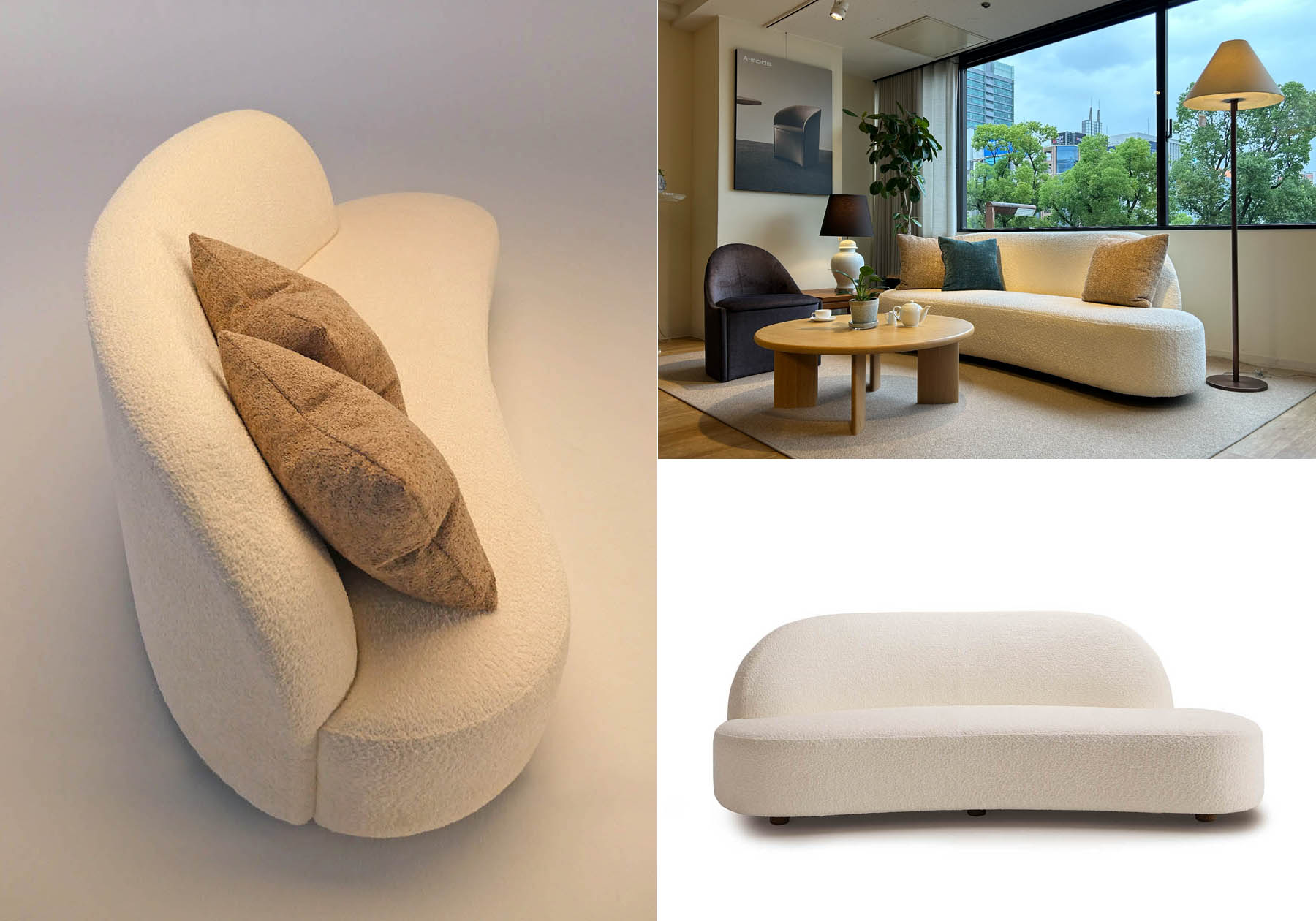 もう一つはMD-905・MD-901のダイニングセットです。楕円形状の柔らかな脚部が特徴的なダイニングテーブルMD-905に合わせたMD-901チェアを、背裏と背表・座面を色違いで張り分けたスタイルで展示をしています。チェアの柔らかいフォルムとアイボリーとウォームグレーのナチュラルなトーンがマッチして、お客様から大変好評です。木部の塗装色はホワイトスプレーを合わせていますので、チェアを2色で張り分けると引き締まった印象になり、後ろから見た時にアクセントにもなります。見る角度により雰囲気も変わりますので、よりインテリアを楽しんでいただけます。オプションで真鍮のハンドルを付けると高級感も出て椅子の移動もしやすくなりますのでお勧めです。