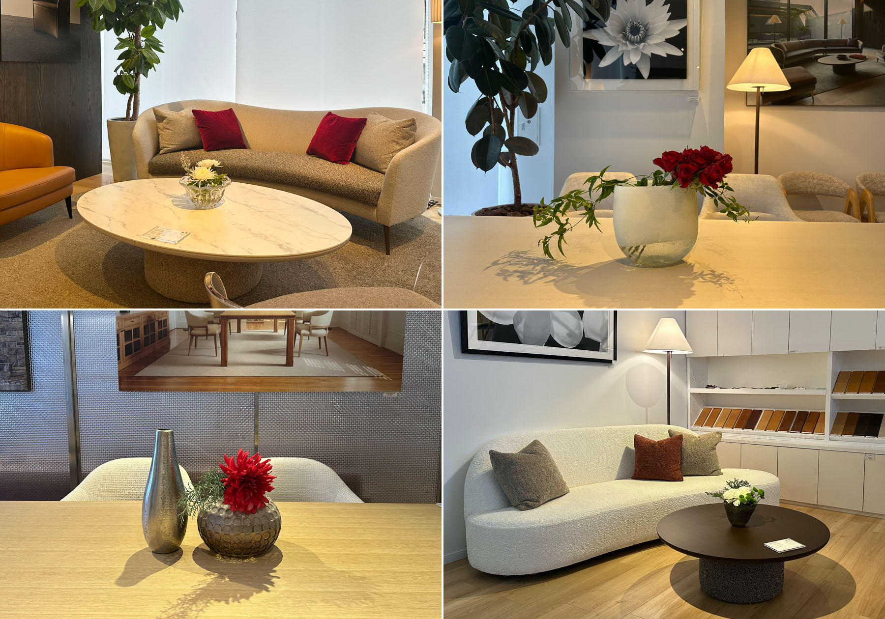 現在、ショールームはニューモデルのテーマをイメージしてディスプレイをしております。お花はピンポンマム・薔薇・ガーベラなどを飾っています。お花は見る人の心を癒しますのでご自宅でも飾っていただくと気分が上がるのでお勧めです。温かみのあるカラーのクッションを合わせて冬のコーディネートの完成です。是非皆様もディスプレイをお楽しみください。