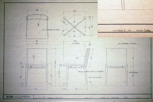 しかし、長く使えるデザイン、古くならないデザインをする事は経験の少ないデザイナーには難しい事で、本当に悩む日々が続きました。その頃から心にあったのは、どこにでもありそうで無いデザイン。一番最初にデザインしたのは、サーコロという四角いスツール。重ねられるシンプルなスツールで、和にも洋にも合う椅子として様々な場所で使われています。次にデザインしたのはCERVO/チェルボという座が脚から浮遊している椅子です。CERVO(イタリア語で鹿)のような脚は色を選べ、故障しても交換できるようにスチールパイプにビスで取付けられる構造で、座と背もステンレス製のバネになるLアングルで組まれました。図面を書く時に苦労したのは、スチールフレームの図面で、木部を組立てからの完成姿からの寸法を割り出すのに、計算機でsin,cos,tanの計算を一日中して割り出し、木部に入れる鬼目ナットにかかる強度も計算して、数日かかって作った計算表を見ながら図面を書きました。数学ってこうやって役に立つんだ、勉強を多少していて良かったと思いました。椅子の完成図ではなく、パーツ図から全て書き終えたのですが、それからが大変でした。