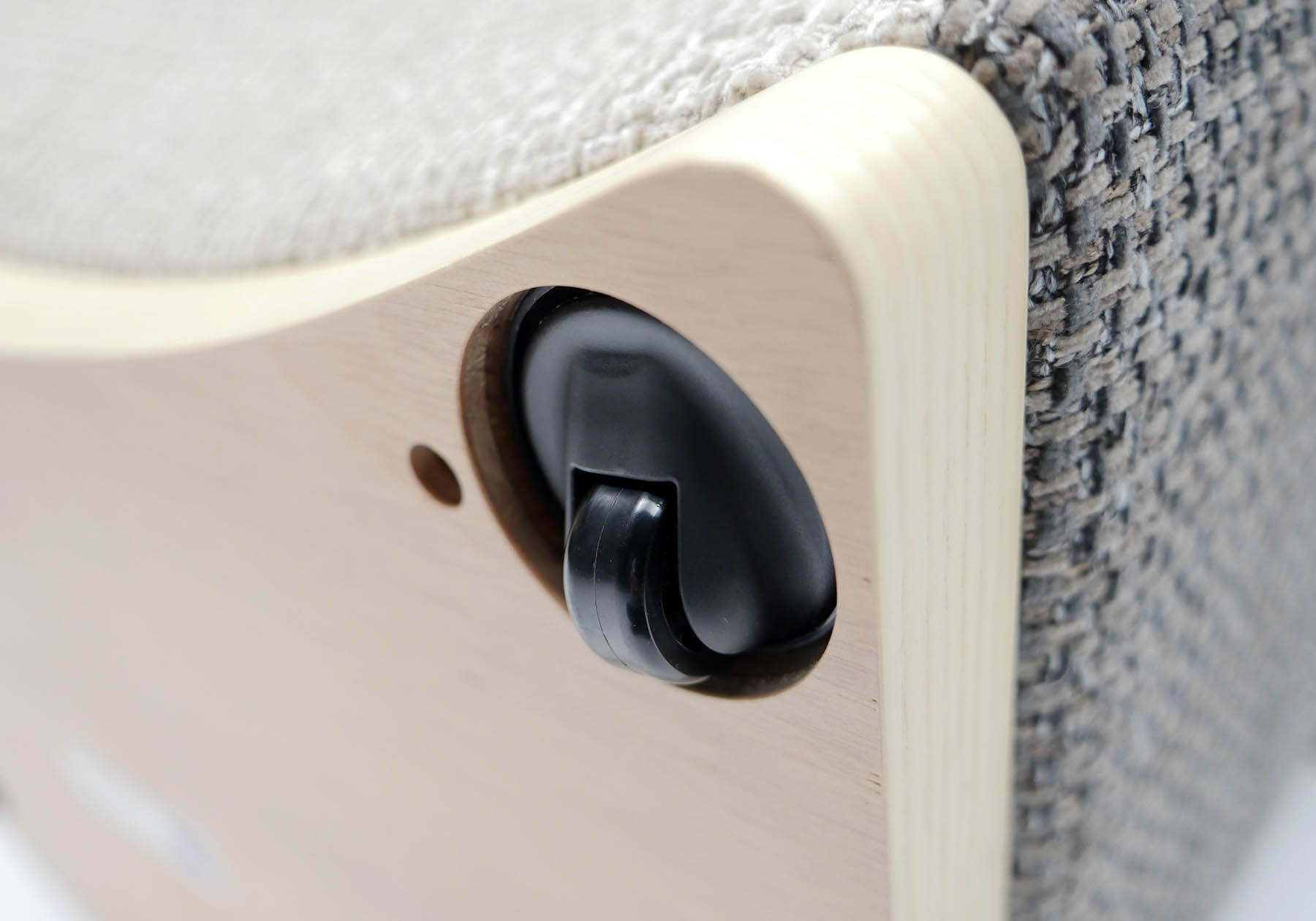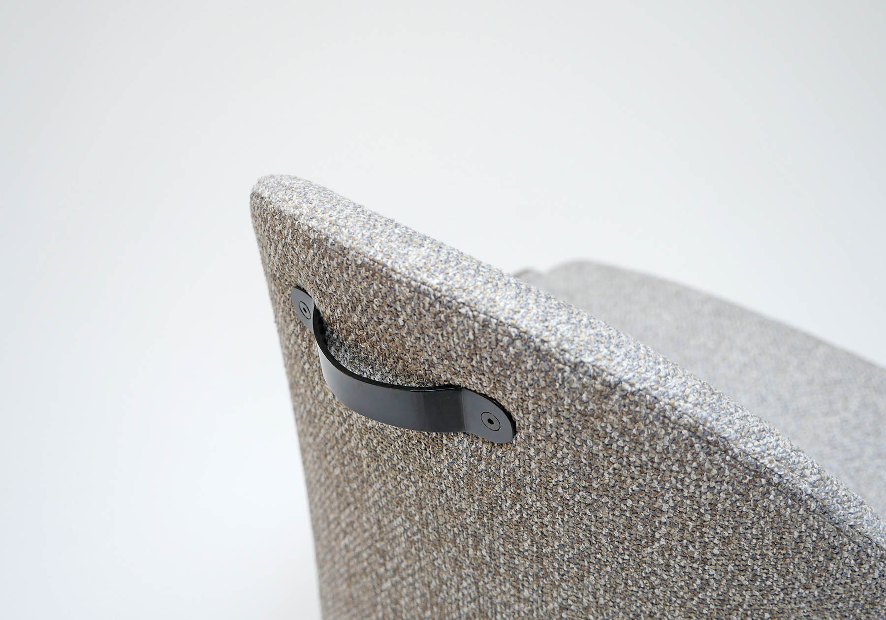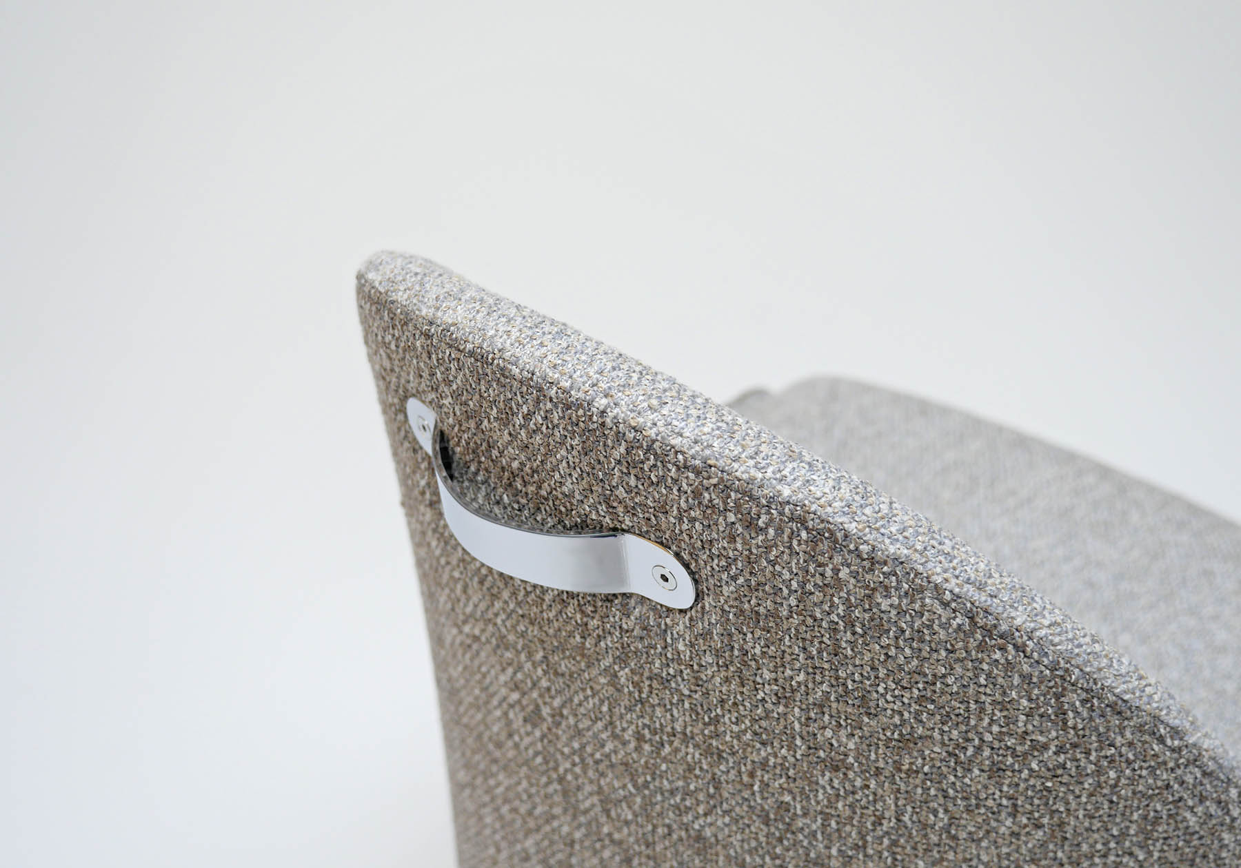 座は下地に布バネのダイメトロールが使われ多層クッション材と合わせて深い座り心地を実現しました。背や座のクッション材のウレタンフォーム材には硬さの違うリサイクルフォーム材のリボンテッドフォームが80%以上使用され、主材の単板と同様に環境に配慮した構造体になっています。脚先の木製の台輪はインテリアに合わせて塗装色が選択でき、取り外すことでソファ用のラウンジチェアとなり、木部の高さを変更する事によってシート高さを変えることが可能です。