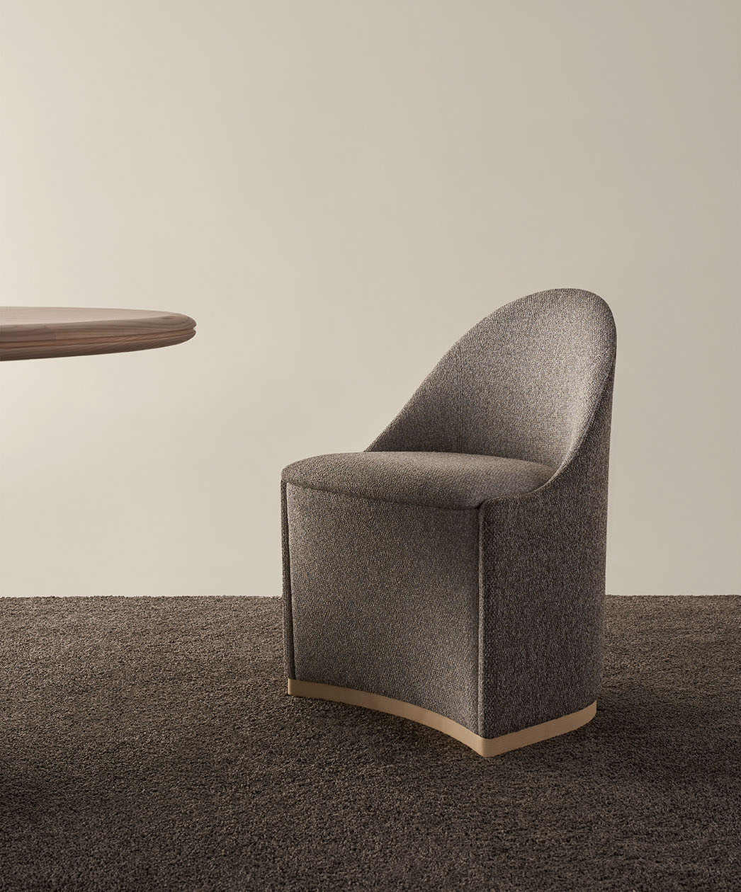 スペースを確保した足元や、ファブリックで覆われた本体を床下の汚れから守る合板材の台輪の脚先は機能的にも考えられています。ゆったりとしたダイニングシーンからミーティングチェアやオフィスチェアとして長時間快適にお使いいただけます。全体のフォルムを作るフレーム全体は木材の単板を3次元の成型でプレスした成型合板で作られます。強度的に優れた成型合板ですが、木材の節や色を選ばず無駄なく使用できる環境に配慮した材料とも言えます。その背にはメッシュ材が背に沿うように張られ腰椎を支えます。
