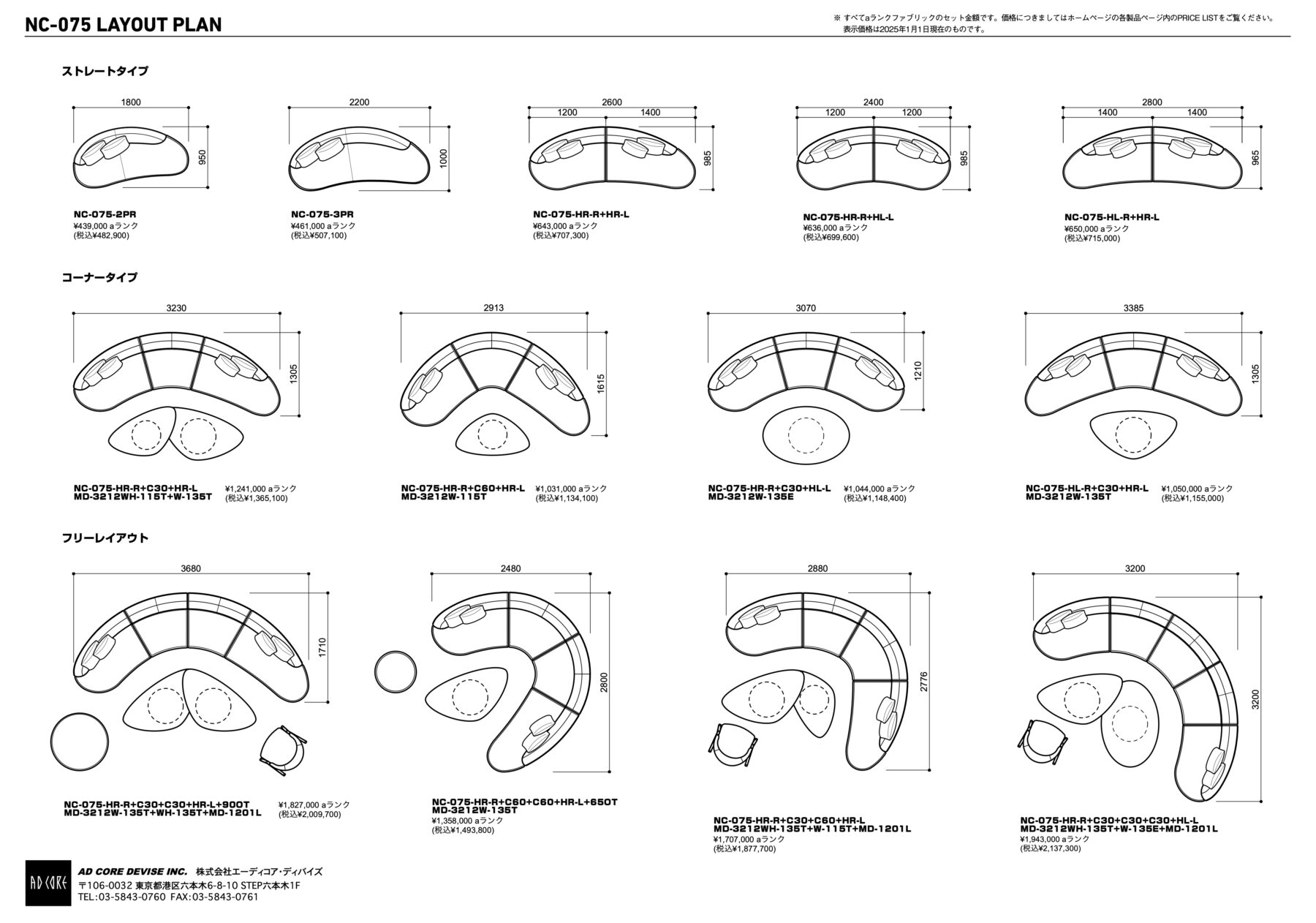 2025モデルではフレンチデコスタイルのキドニーソファに使いやすい4人用にワイドアップのセパレートさせたセットと有機的な形はそのままにシステム構成できる30度と60度のコーナーソファ、それに合わせるオットマンをバリエーション追加しました。