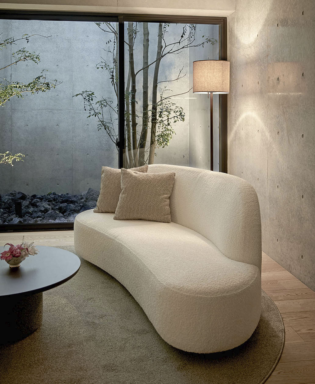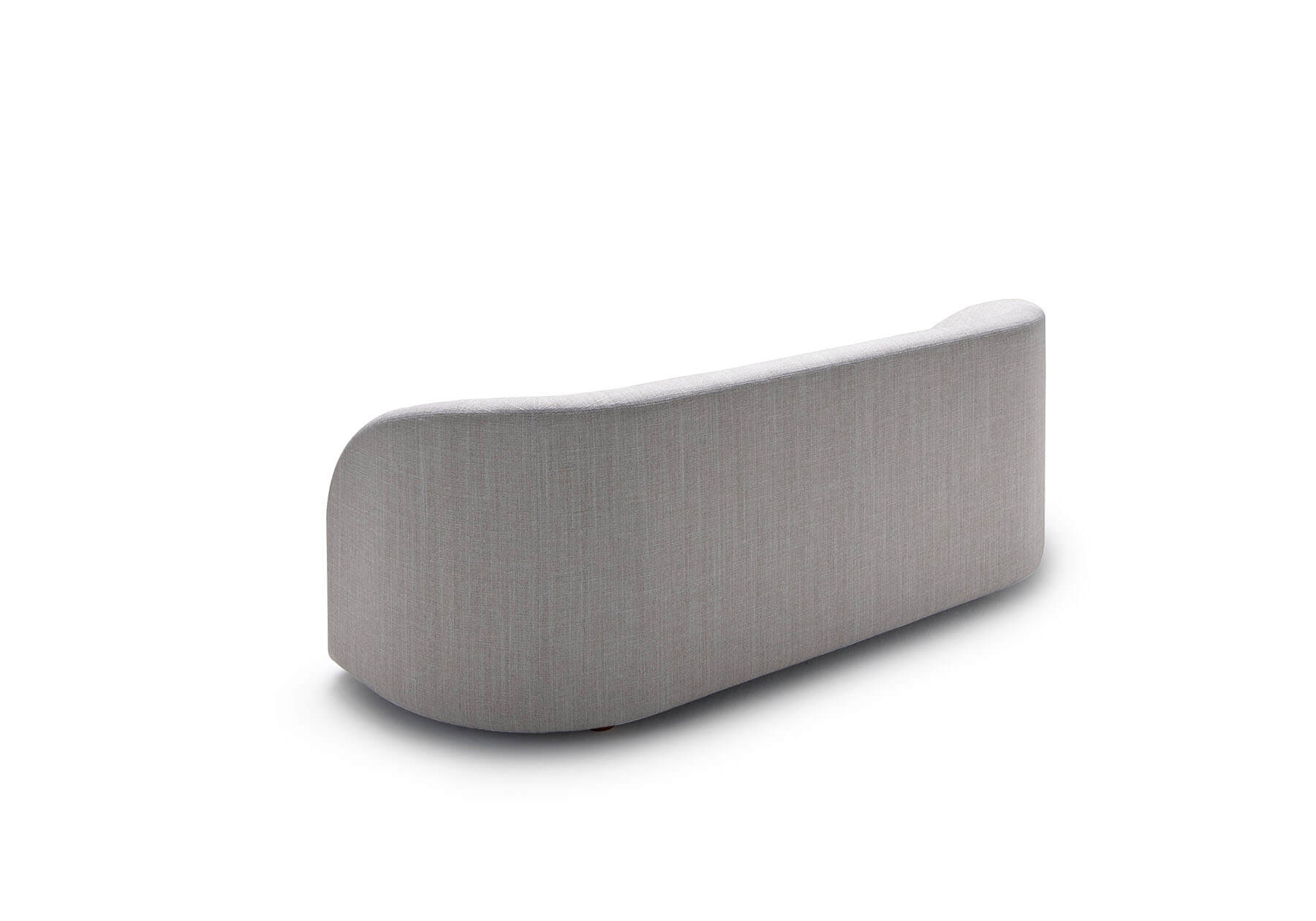 流れるような有機的なフォルムのキドニーソファ。腎臓のような有機的な形状で、非対称の柔らかなカーブとボリュームのある座と背を持っています。空間の中に独立して置くためのフォルムと機能で座り方を限定しません。有機的なミニマリズムと贅沢なボリューム感のあるシルエットで、フレーム下の丸みが空間に浮いているような印象を与えます。