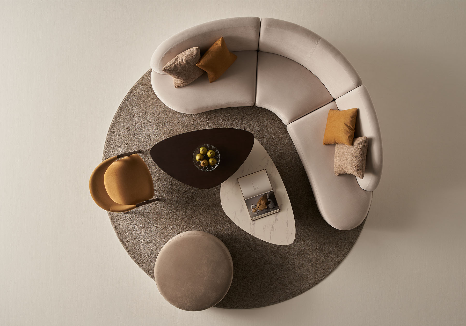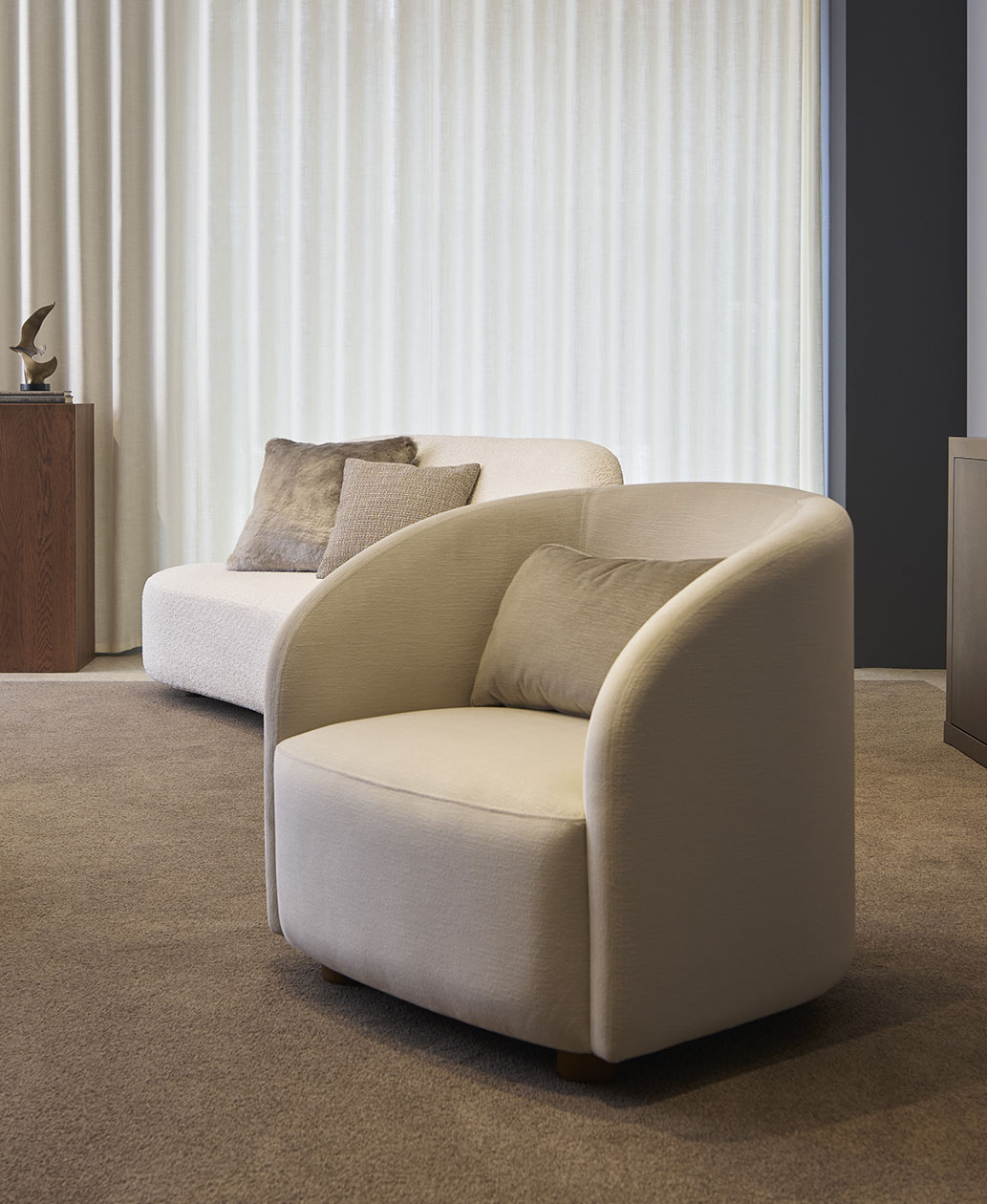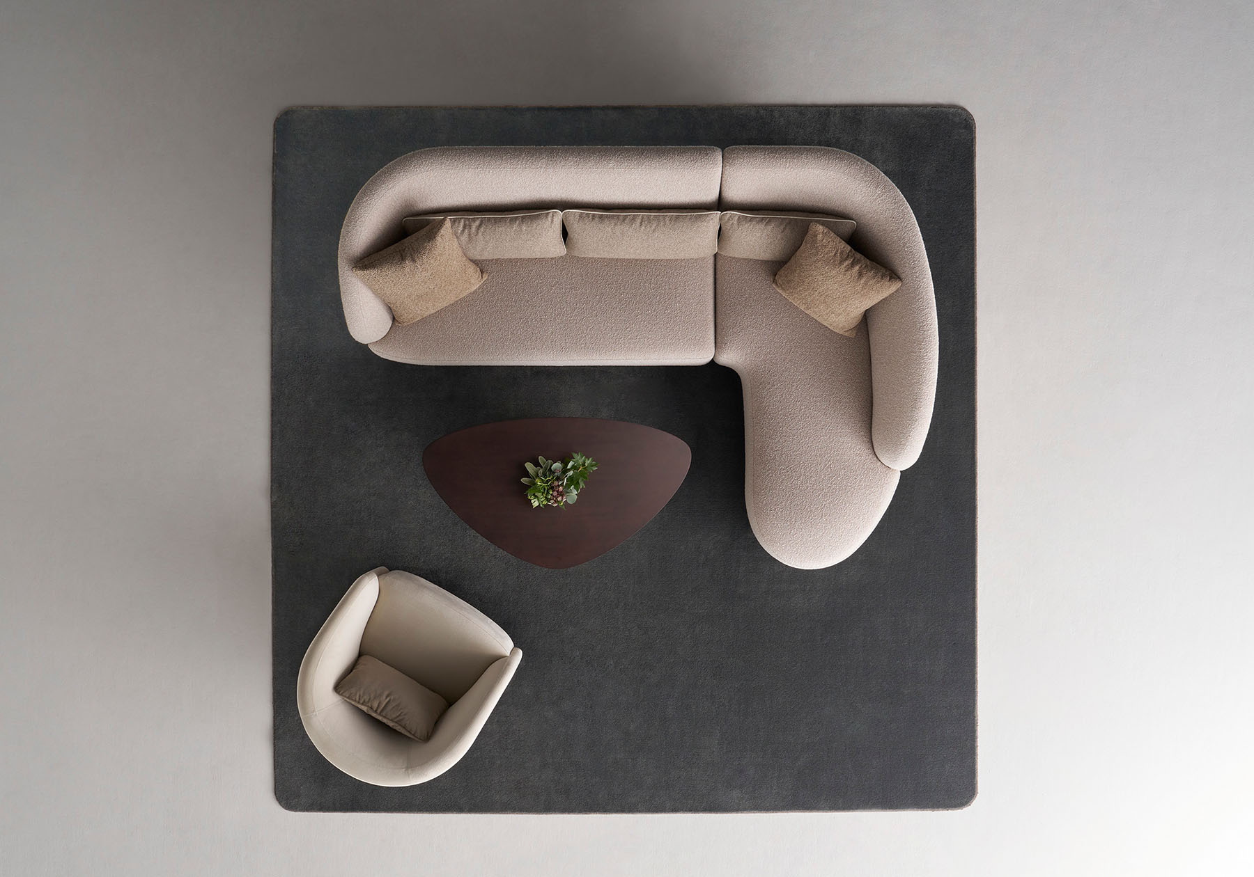 2026モデルでは、W2,200の3人用とW1,800のコンパクトな2人用、W2,600の4人用、システム構築に必要な30度、60度の角度を持ったコーナーソファ、ボリューム感を合わせ たφ650、φ900オットマンの、アームを持ったW2,100の3人用、W1,600の2人用片アー ム、独立しても使用可能なシェーズロング、キャスターも選択できる1人用のラウンジチェアと独特なフォルムは合わせる空間やラウンジチェアを選びません。空間の中心に置かれるソファは住空間のリビングやホテルラウンジなど洗練された空間でご使用いただけます。