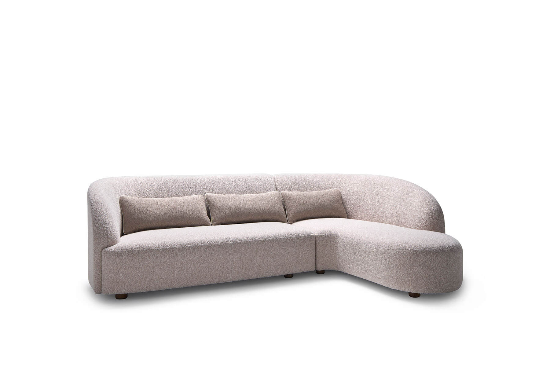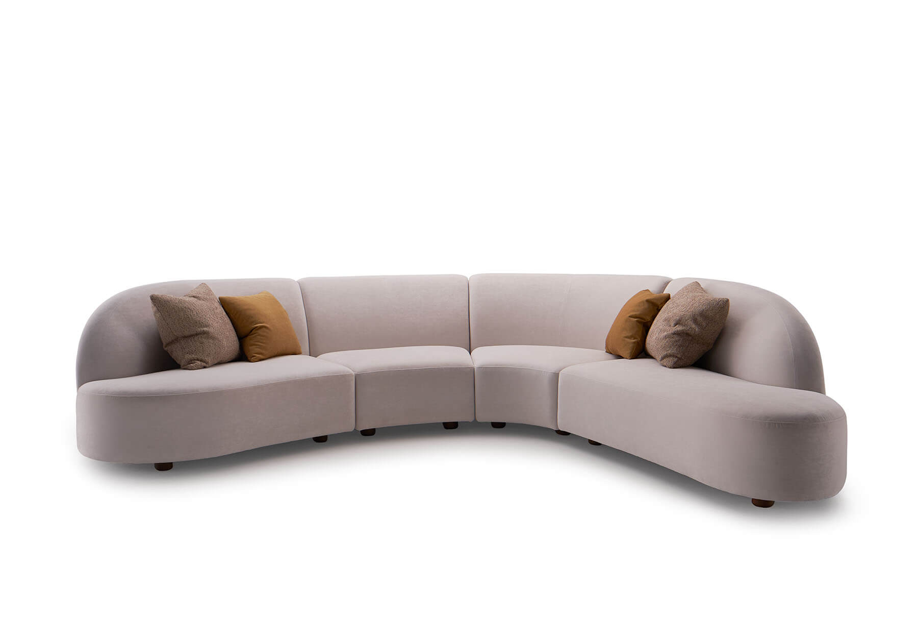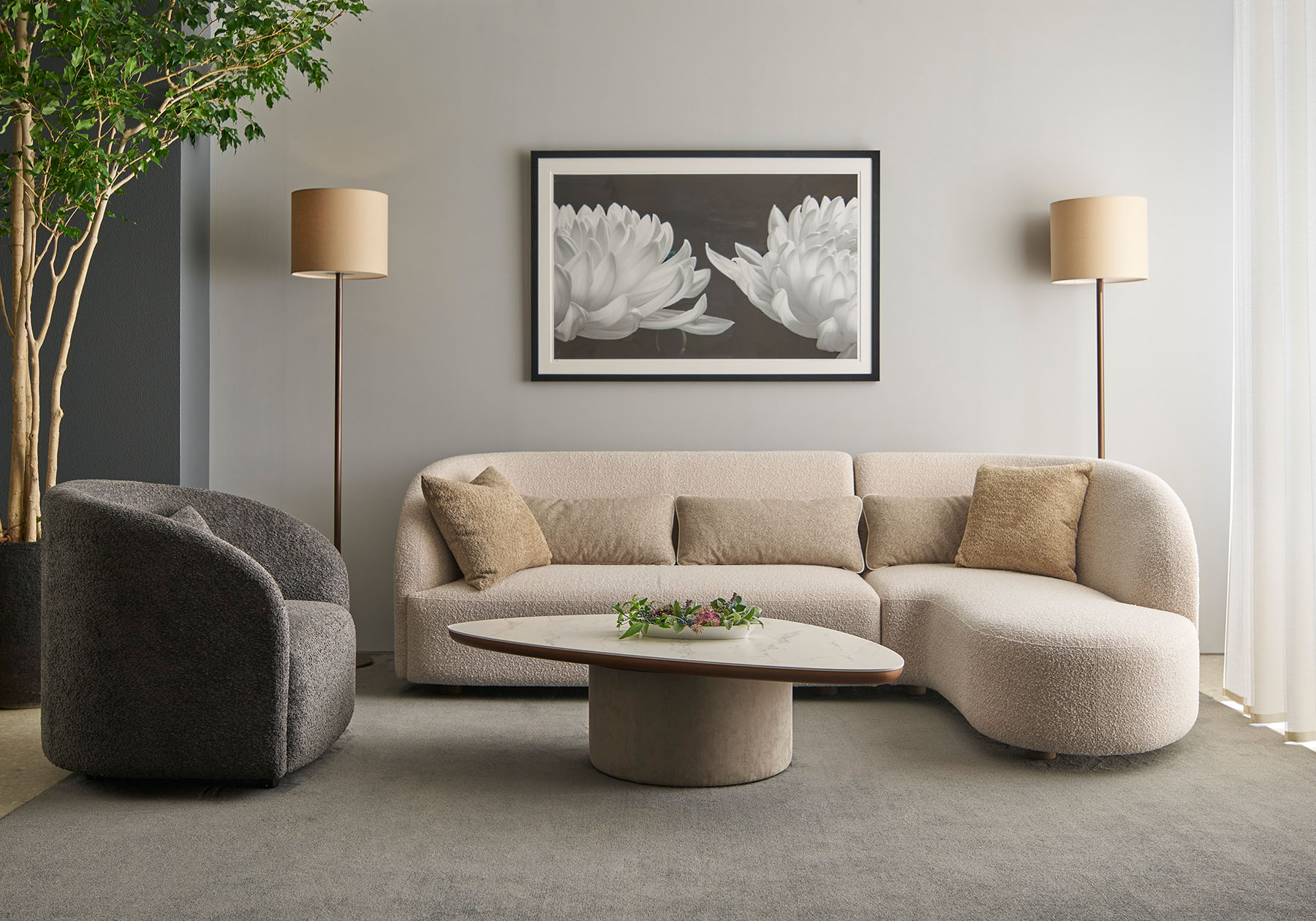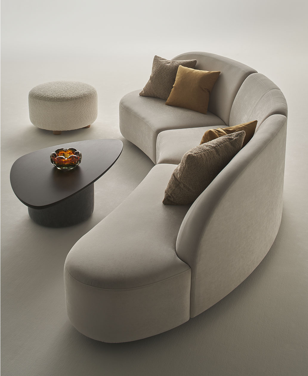 2025モデルではフレンチデコスタイルのキドニーソファに使いやすい4人用にワイドアップのセパレートさせたセットと有機的な形はそのままにシステム構成できる30度と60度のコーナーソファ、それに合わせるオットマンをバリエーション追加しました。