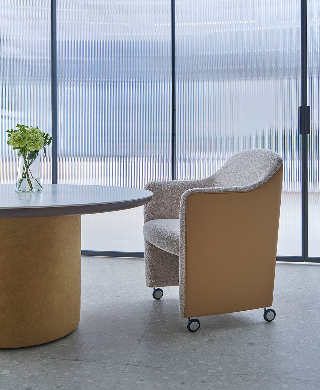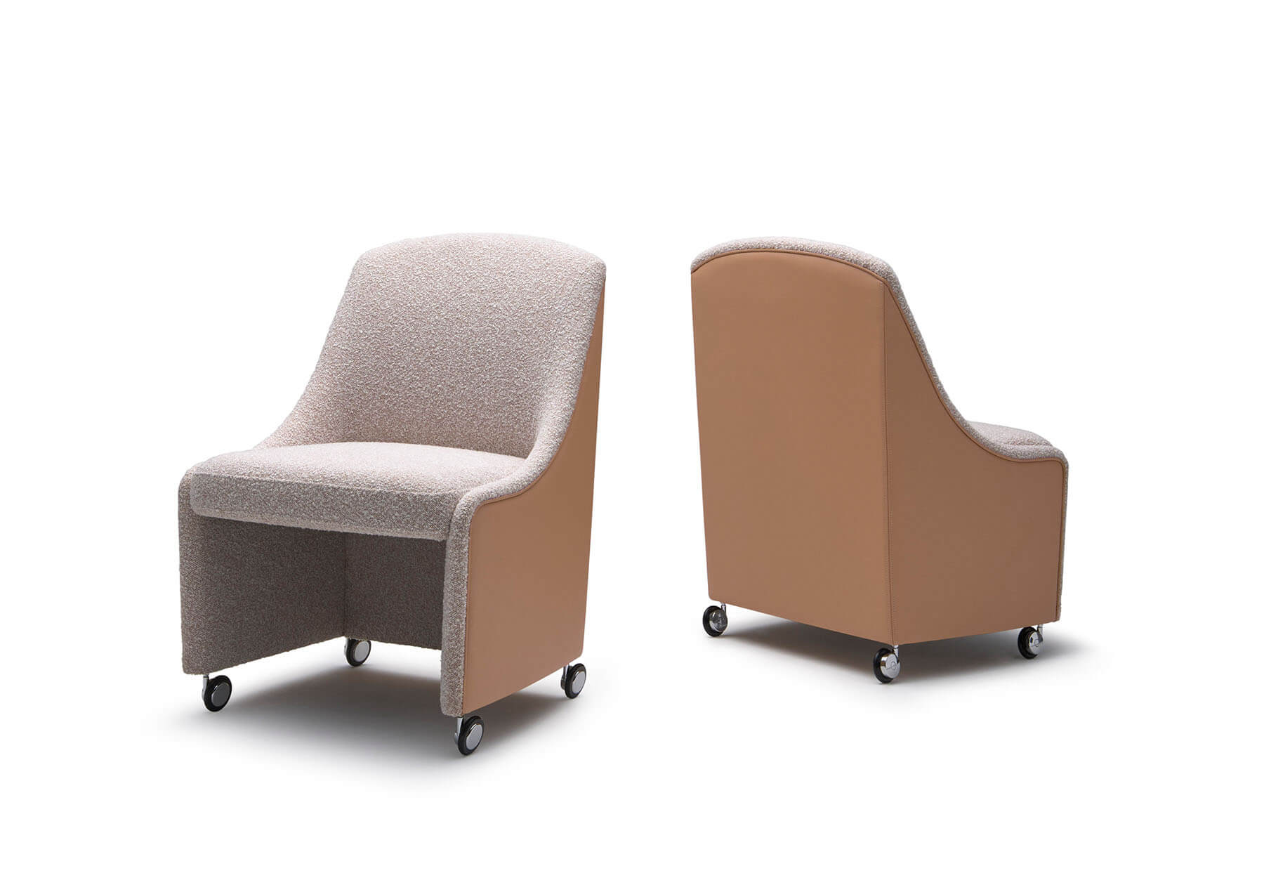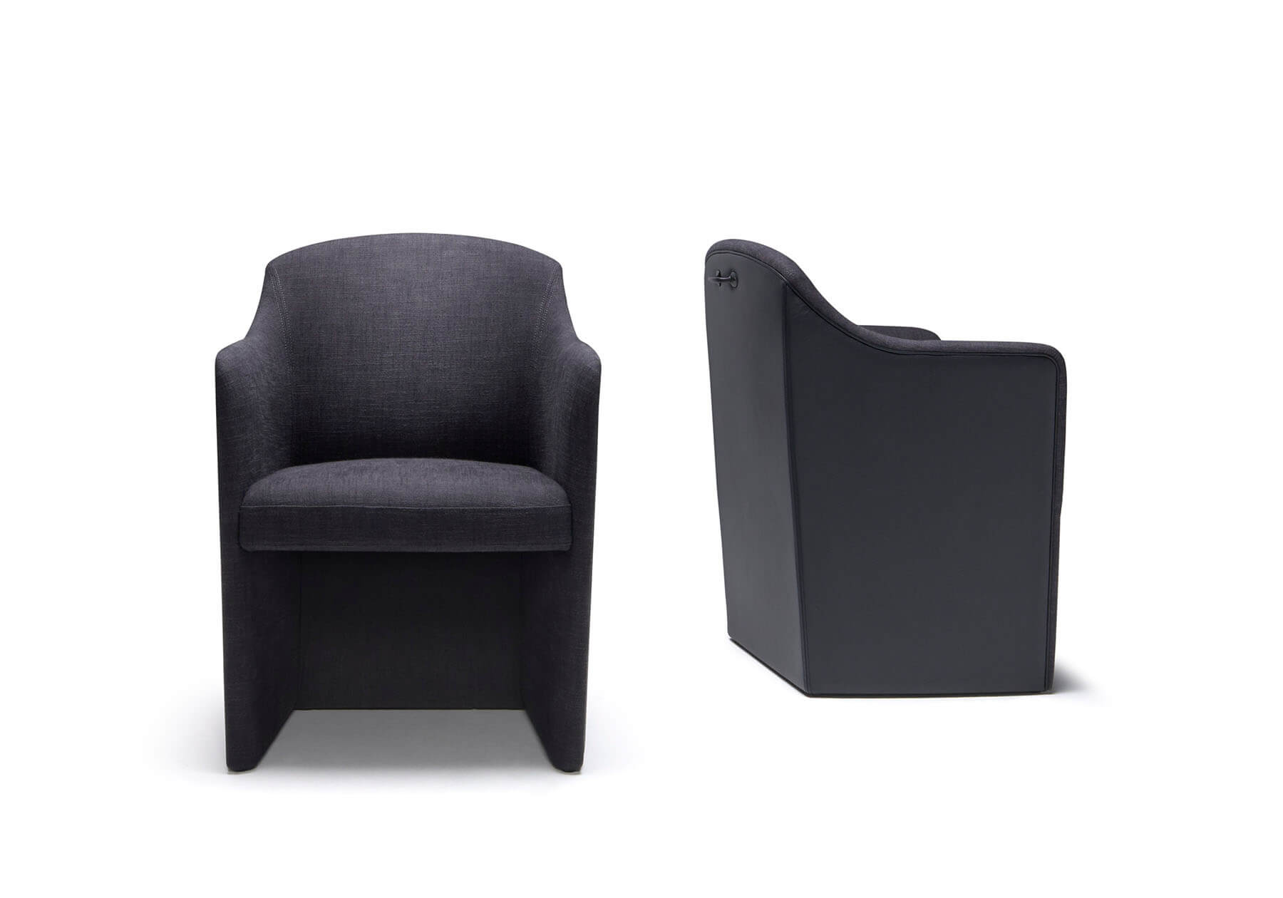 フォーマルで柔らかな印象の中に大 人のカジュアルを感じさせるスタイリッシュさを持たせました。 包み込まれるフォルムは大きすぎず閉鎖的でもない、快適さを計算されたモジュールでデザインしまし た。柔らかなカーブを持つサイドフォルムはアームタイプとアームレスタイプがあり、フォーマルな空間で用途別に使い分ける事が可能です。背からアーム、本体下部にはパイピングが施され、オプション で色を変える事でクラシカルでフォーマルな印象を際立たせます。脚先まで包まれるタイプとキャスタータイプがあり、フォーマルなダイニングからオフィス空間まで幅広い用途に応えます。
