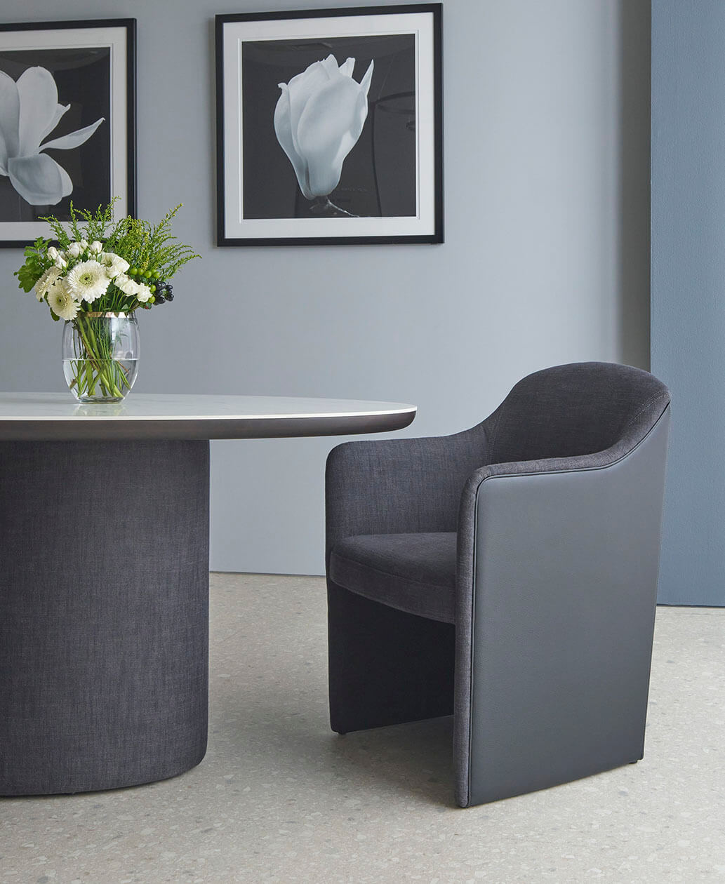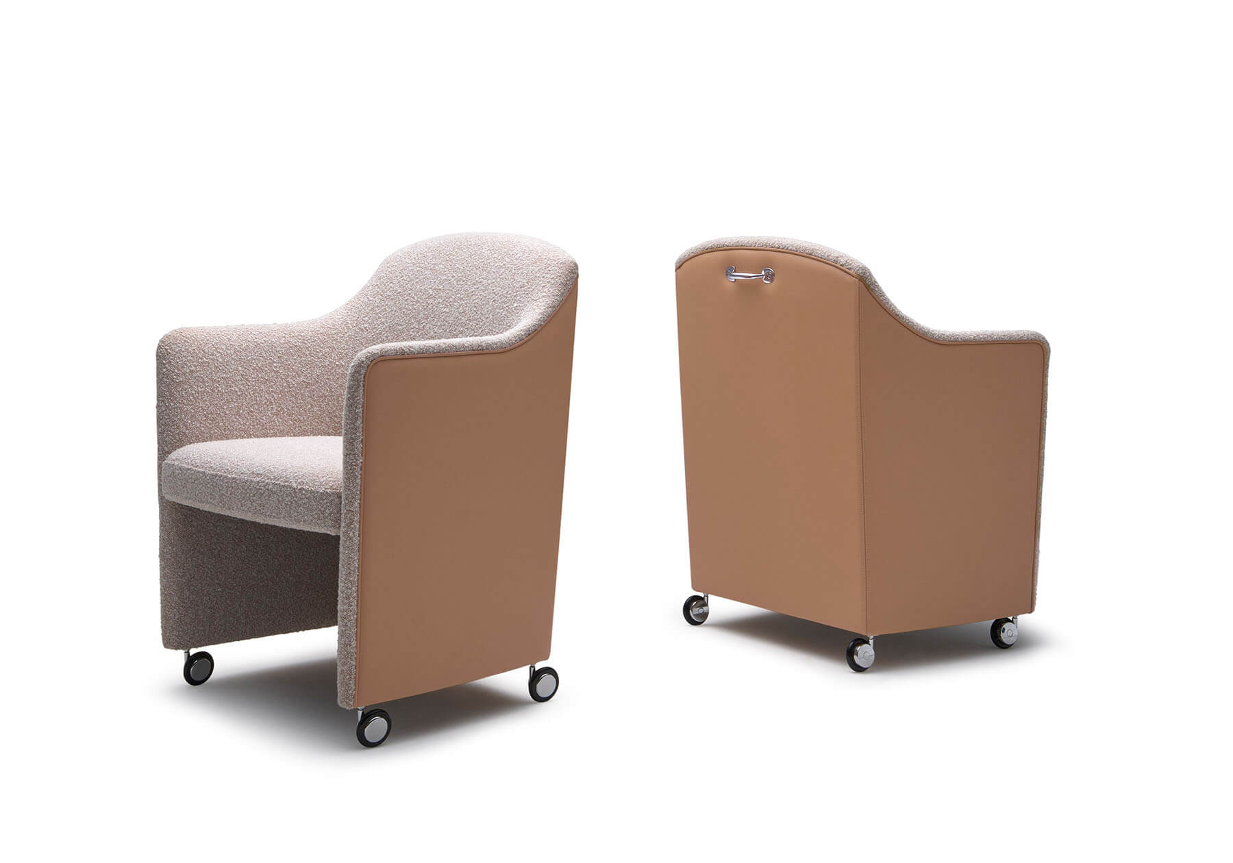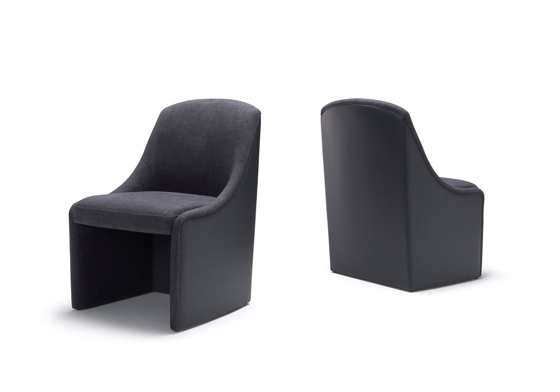フォーマルで柔らかな印象の中に大 人のカジュアルを感じさせるスタイリッシュさを持たせました。 包み込まれるフォルムは大きすぎず閉鎖的でもない、快適さを計算されたモジュールでデザインしまし た。柔らかなカーブを持つサイドフォルムはアームタイプとアームレスタイプがあり、フォーマルな空間で用途別に使い分ける事が可能です。背からアーム、本体下部にはパイピングが施され、オプション で色を変える事でクラシカルでフォーマルな印象を際立たせます。脚先まで包まれるタイプとキャスタータイプがあり、フォーマルなダイニングからオフィス空間まで幅広い用途に応えます。