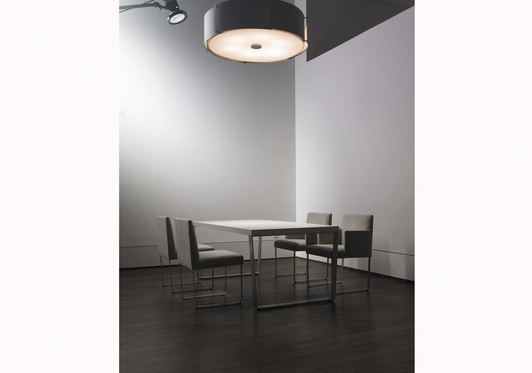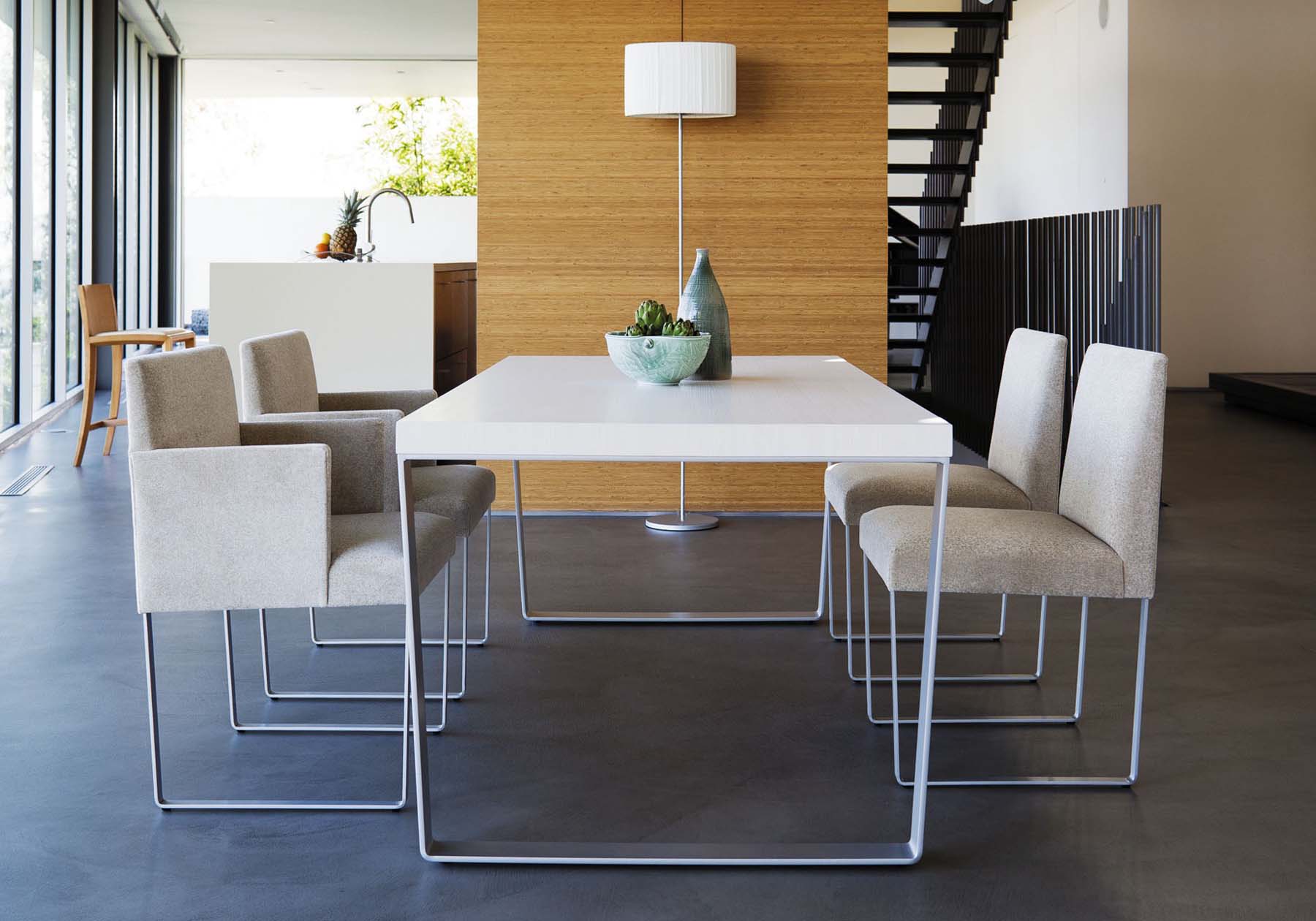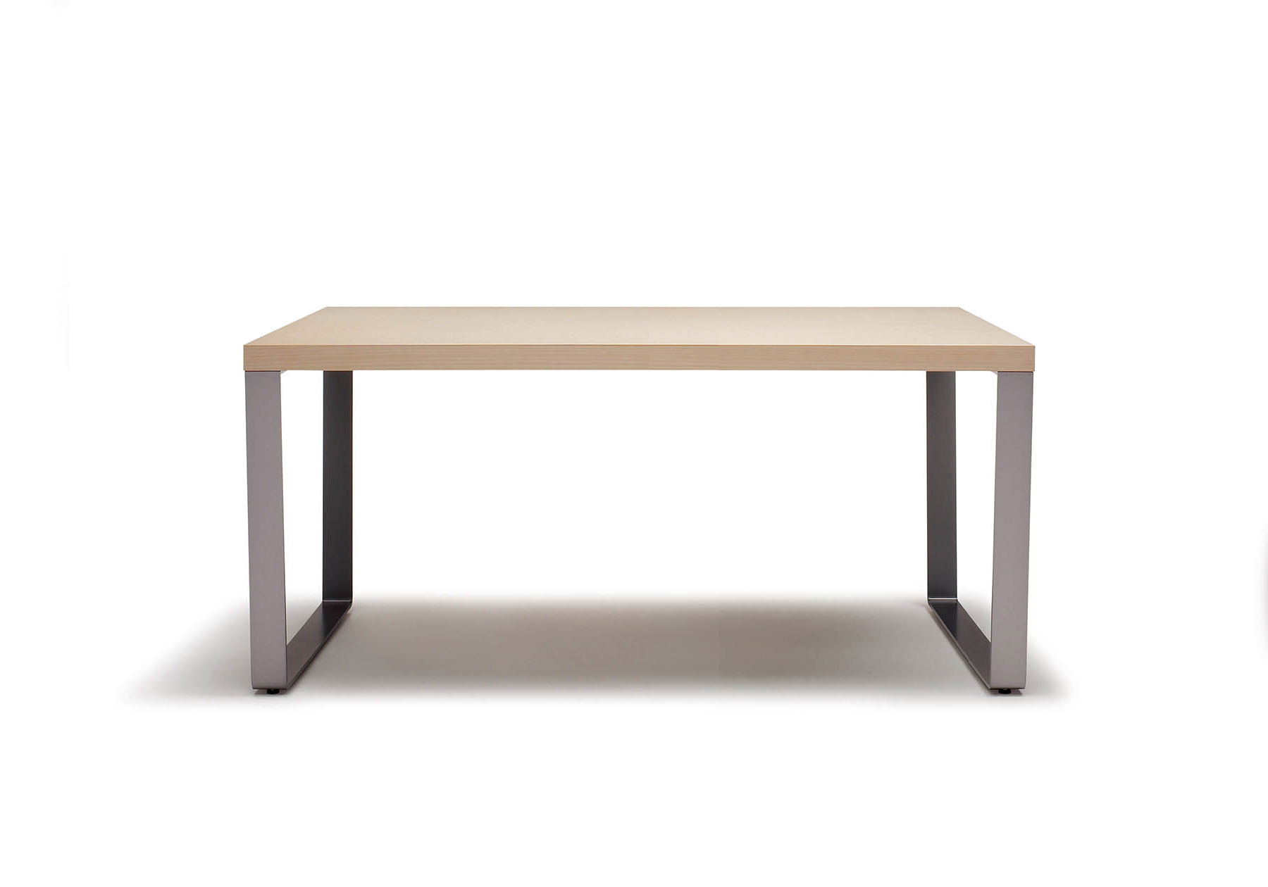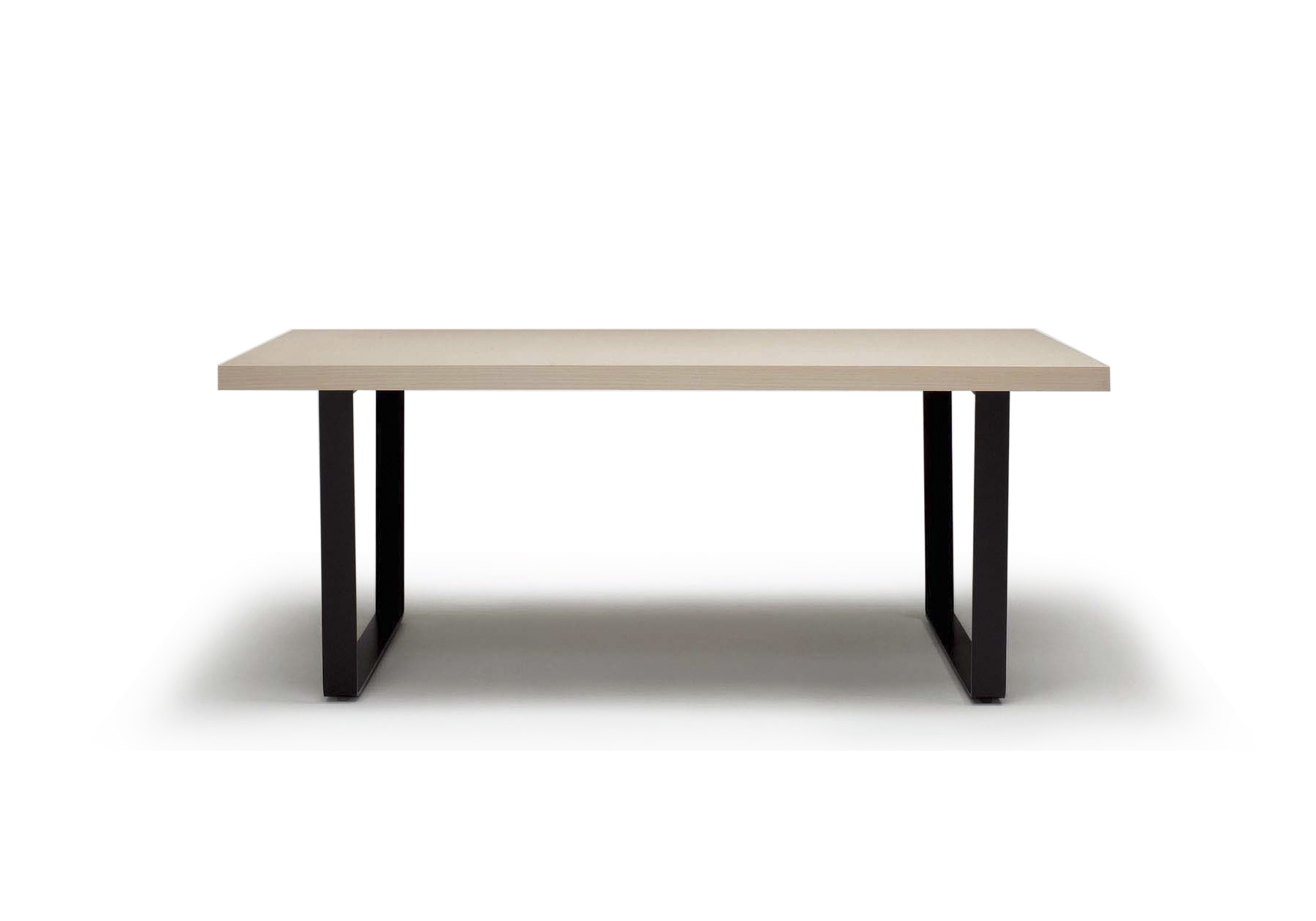 ダイニングチェアMD-101に合わせてデザインされたダイニングテーブルです。スクエアな木製天板と2本のスチール脚のシンプルな組み合わせが、テーブルの存在感と軽快なシャープさを表現します。