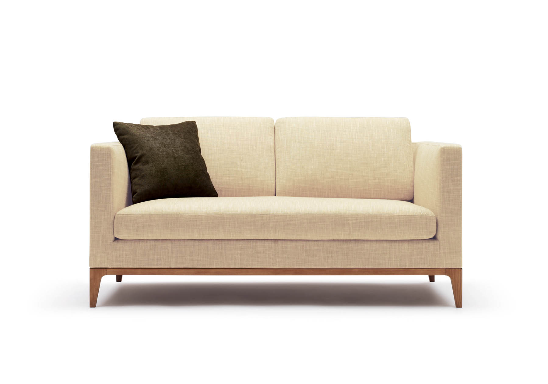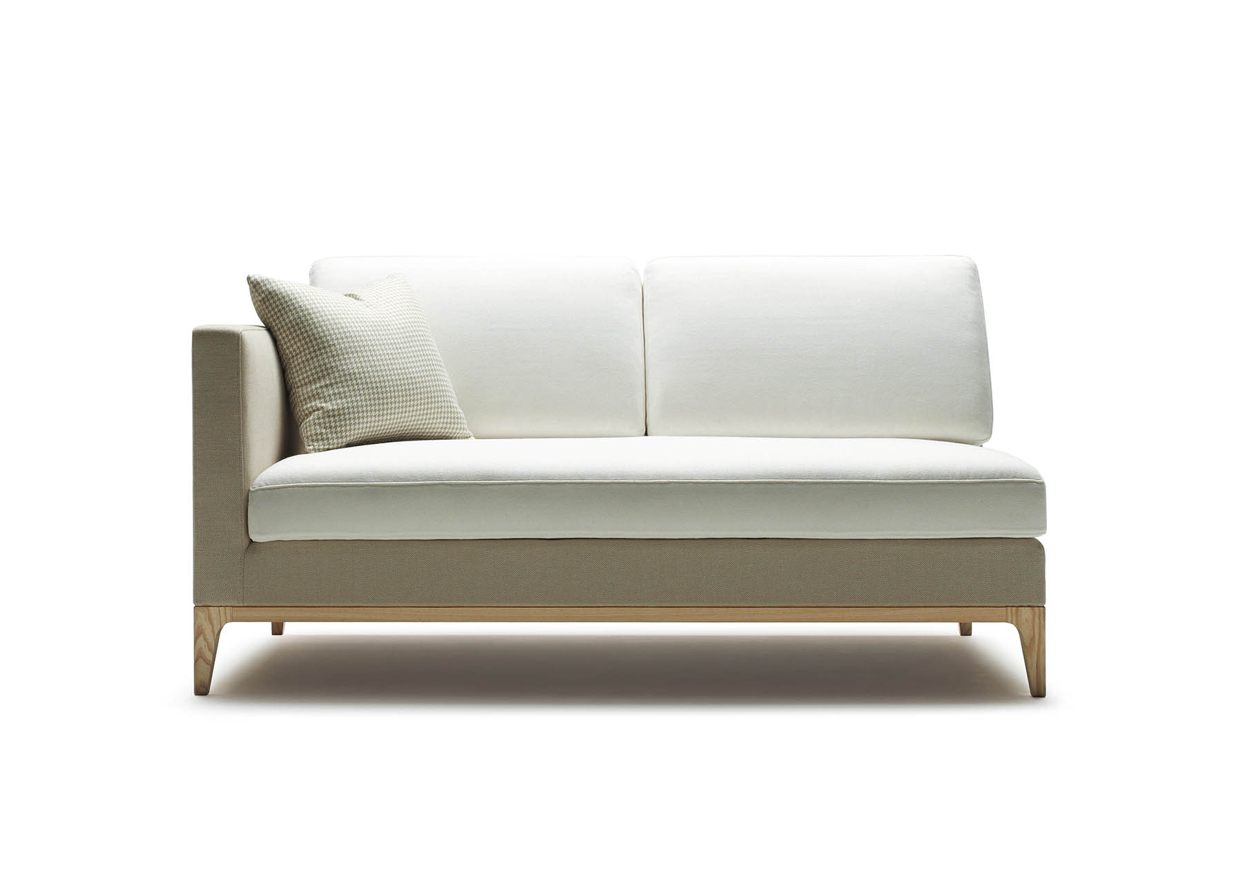 本体のスクエアな特徴はフレームの下までシャープなデザインです。これは木部に張っているウレタンフォームの下に形状をしっかりと出す為に木のフレームを回しているからウレタンが潰れずに形を出す事ができます。こういった手間がデザイン性の高い物を作る事ができます。当社のソファの特徴は本体やアームの上部を手で触ると分かるのですが、腰をかける事や頭を乗せる事もある上部にはハードウレタンを置いて木フレームを感じにくくしています。単体の1P、2P、3P、システムソファに組み合わせるシェーズロング、片アーム2Pのバリエーションもご用意しています。
