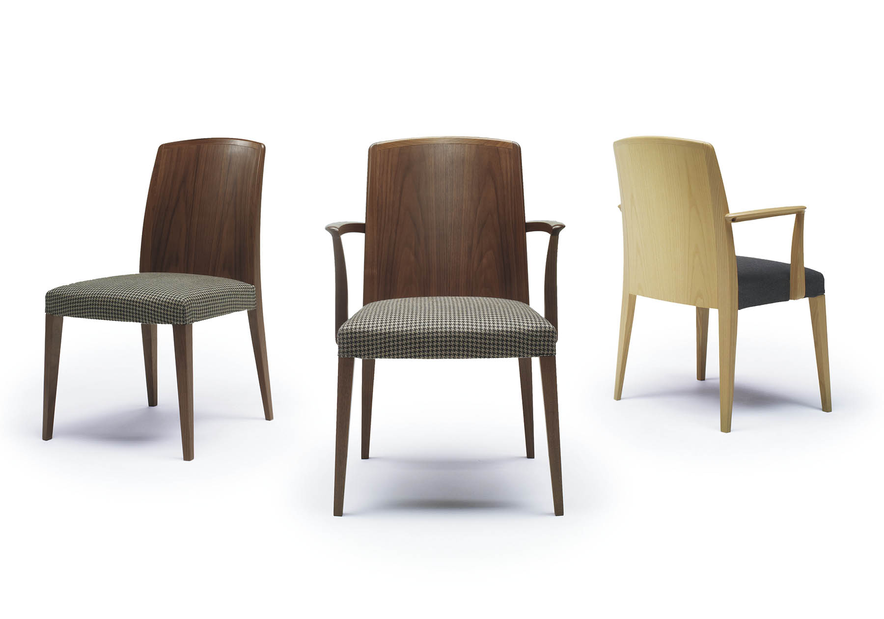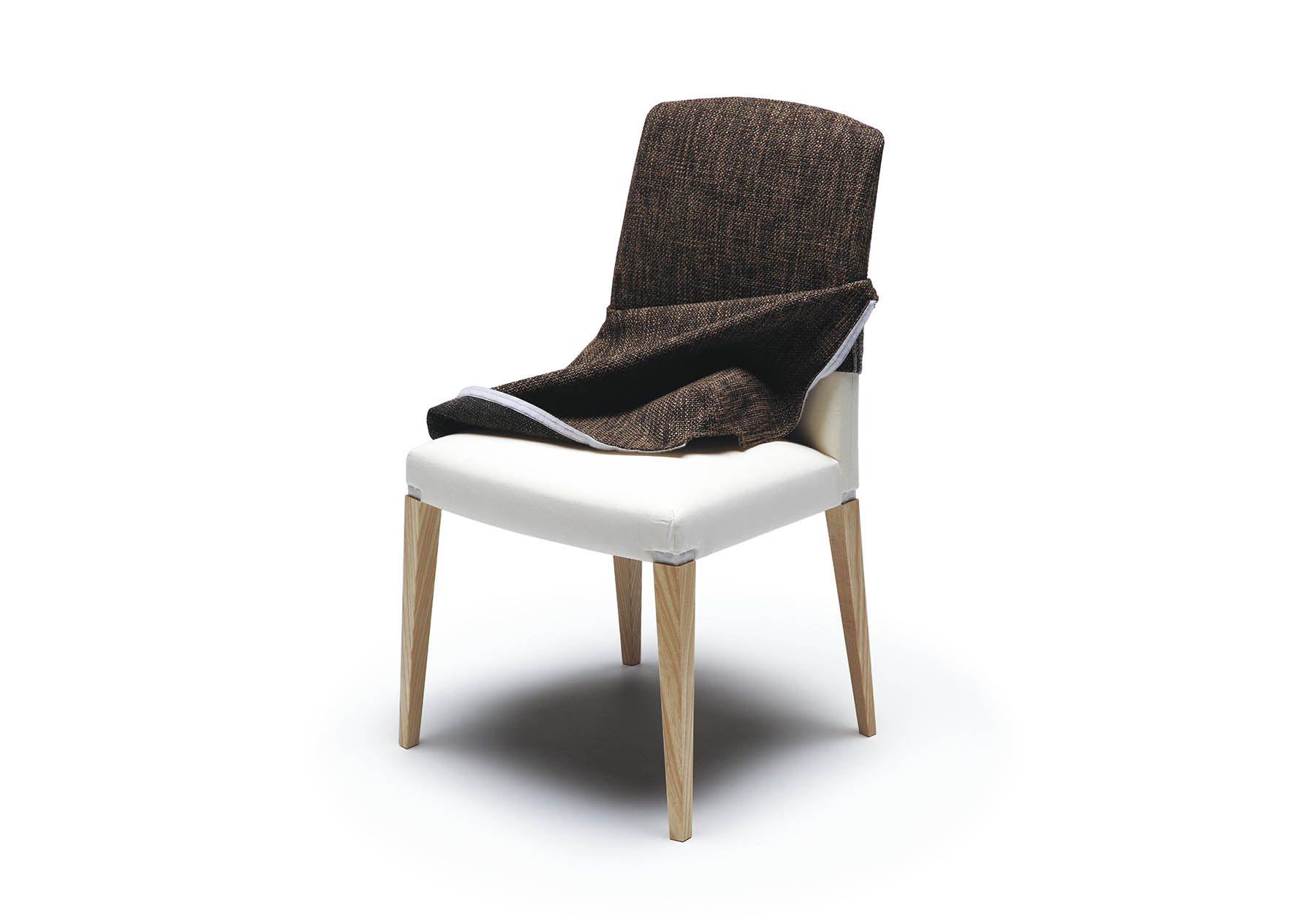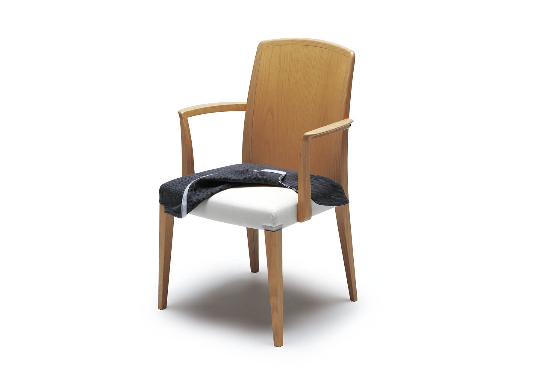 ファブリック部は背座共カバーリングシステムを採用し、座面下のベロクロに取り付けられ、取り外しが可能です。フレームはウォールナット材とホワイトアッシュ材の2種類あり、サイドチェアとアームチェアの用意があります。アームチェアは木材を緻密に削り出し、北欧ヴィンテージ家具のような優しい手触りとなっています。このアーム部の接合はホゾ構造とダボを併用し強度を出しています。