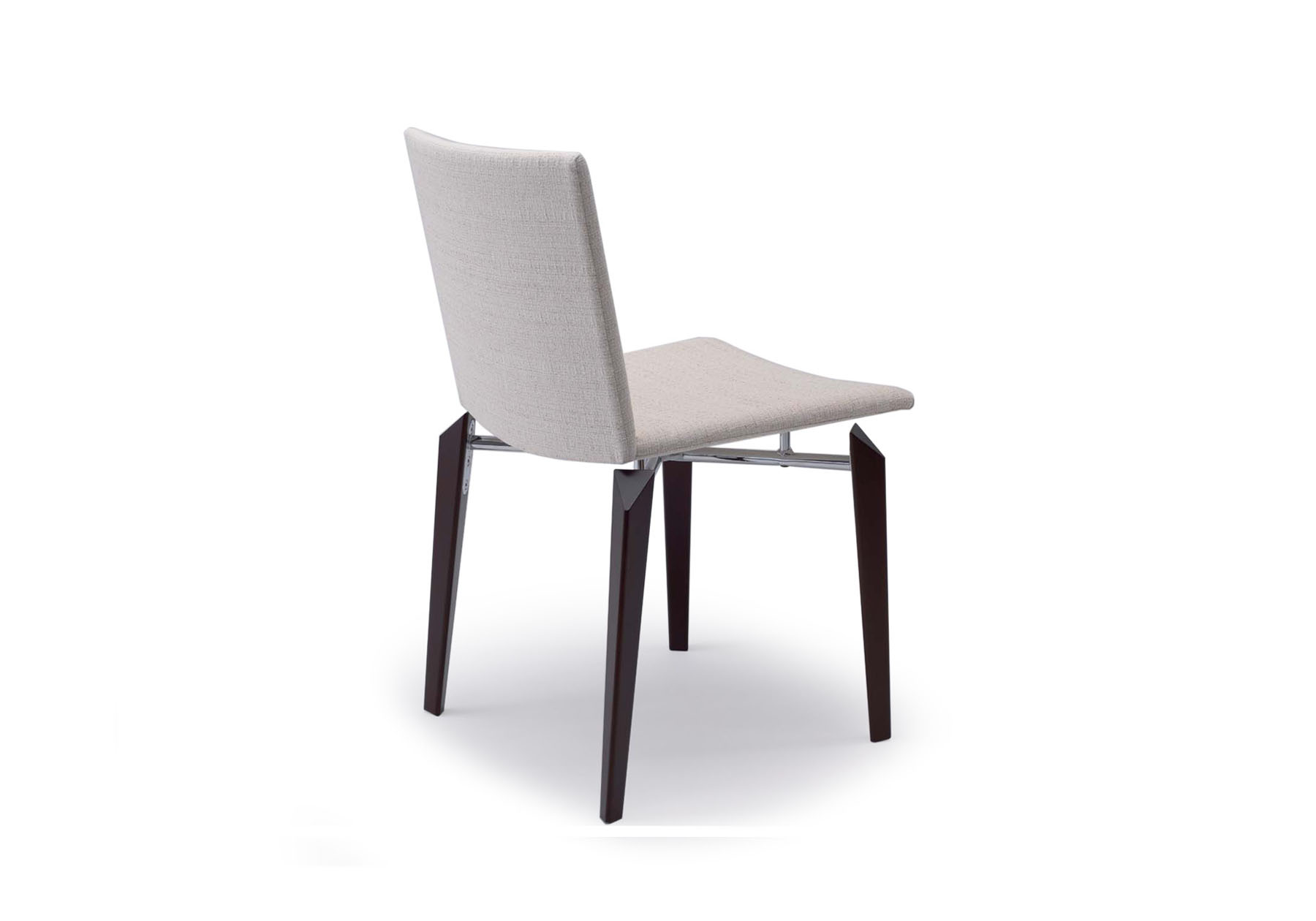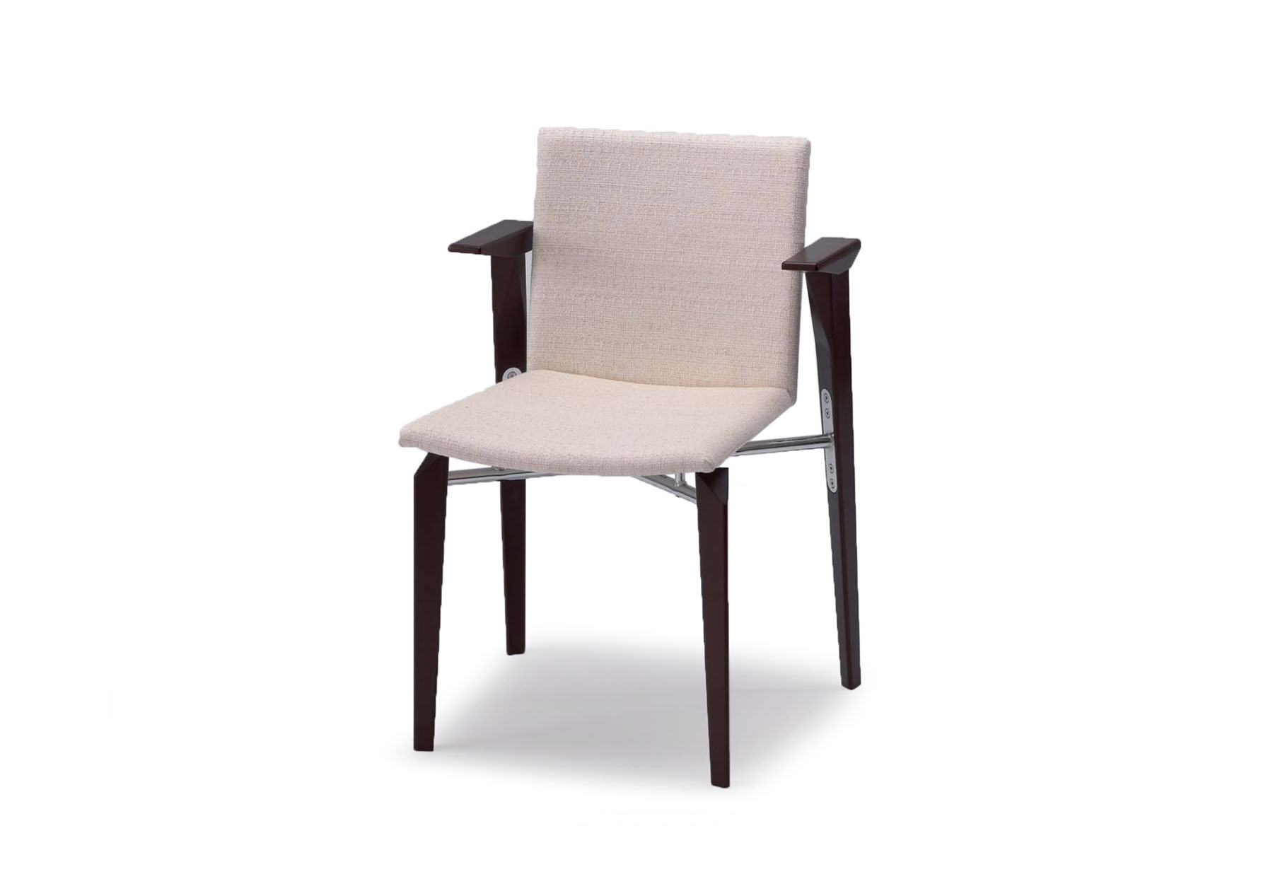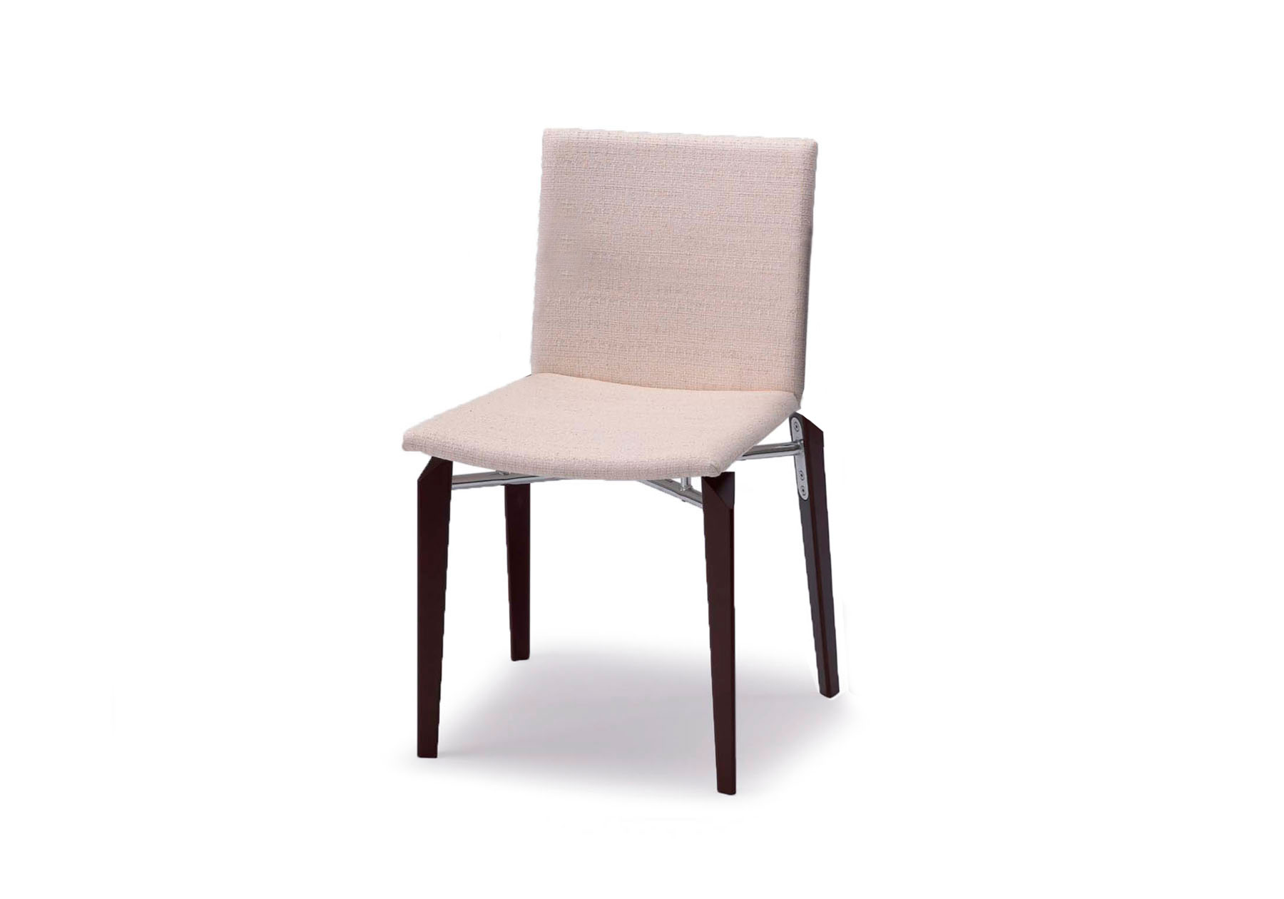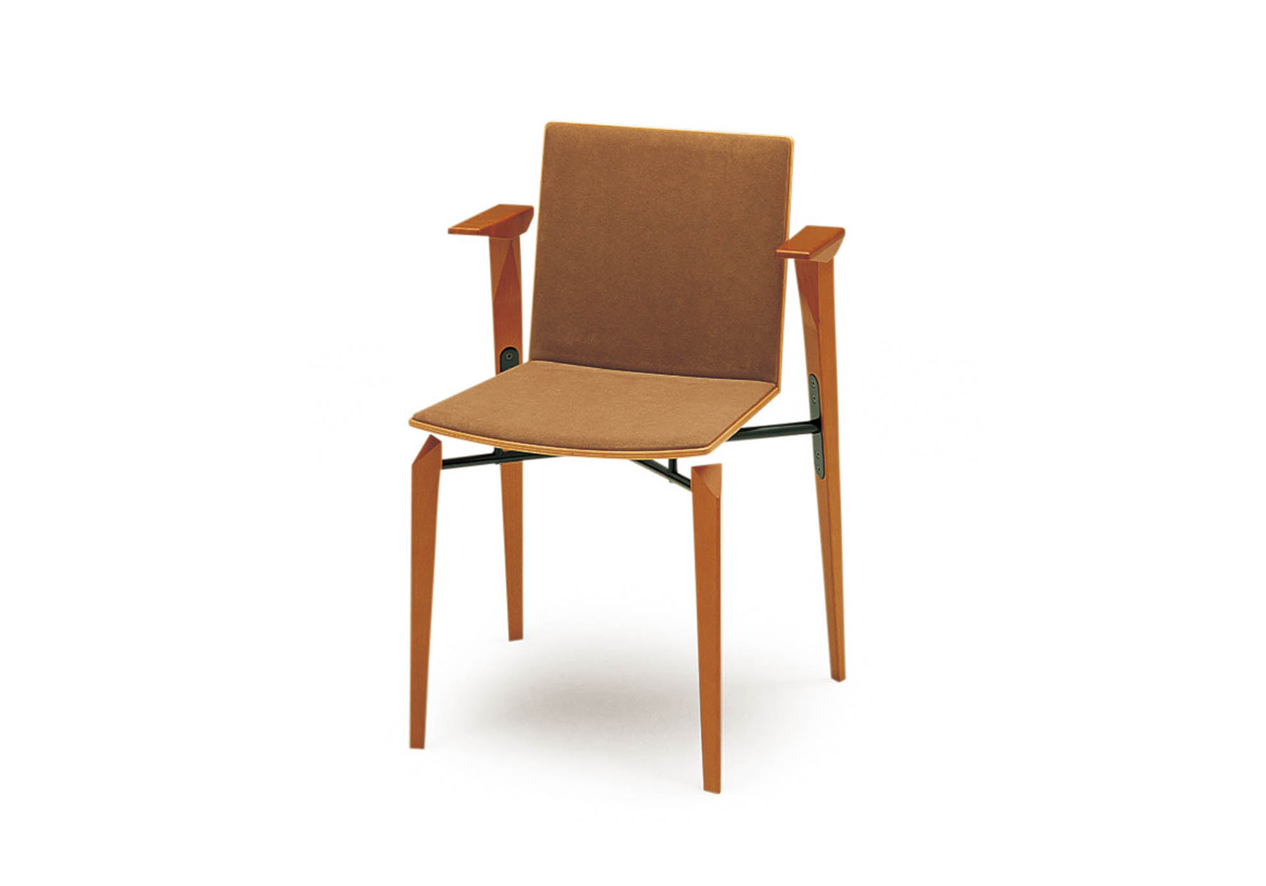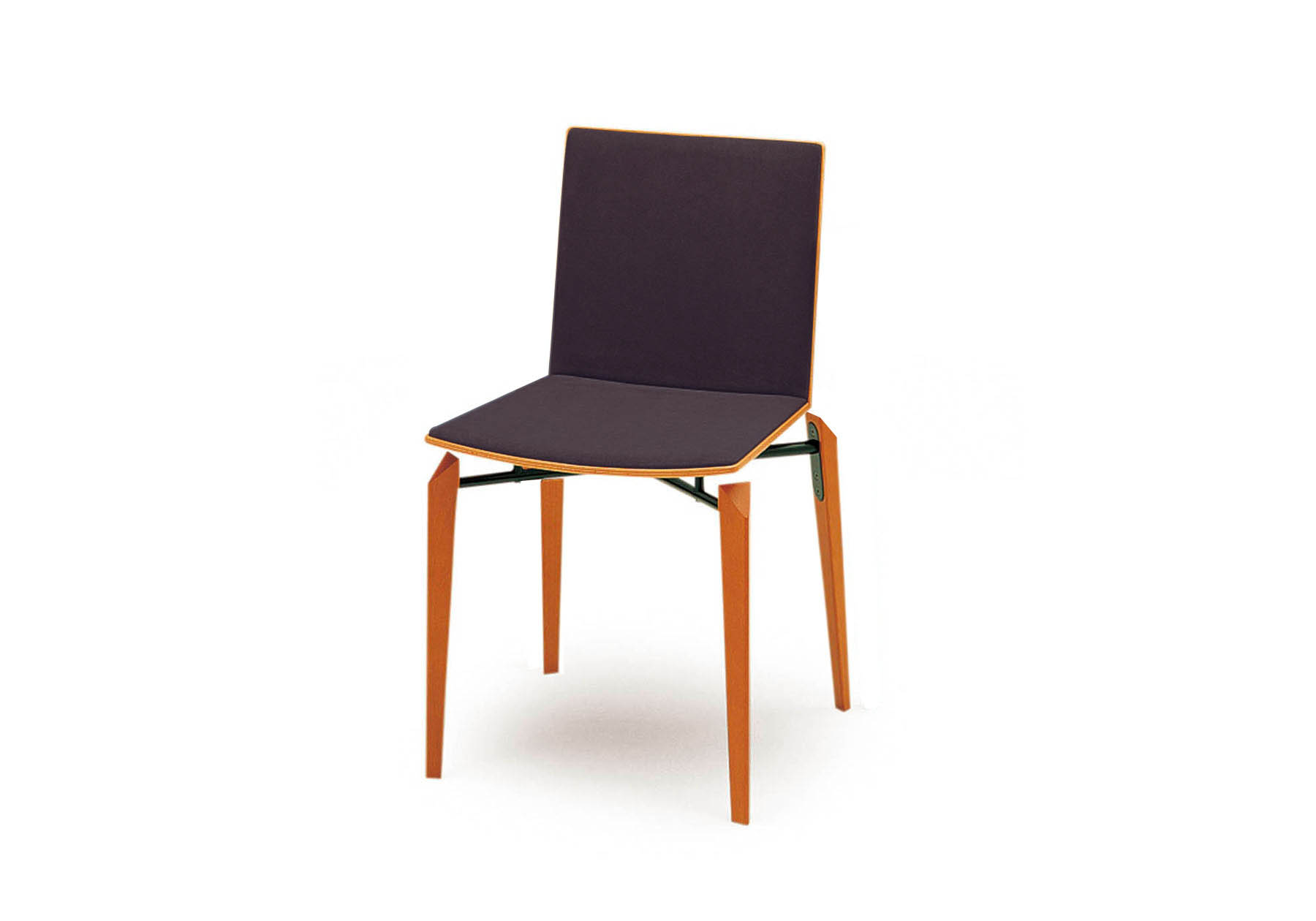 1986年の誕生以来、エーディコアのベストセラーモデルです。成型合板の背と座はステンレスL字アングルで接合され、バネのようなクッション性があります。成型合板のシェルとスレンダーなビーチウッド材の脚を繋ぐXフレームと名付けたスチールパイプフレームが、座が浮遊したような軽やかなデザインと椅子全体の強度を保つ役目を担います。パーツ化された構造は、メンテナンス性に優れています。