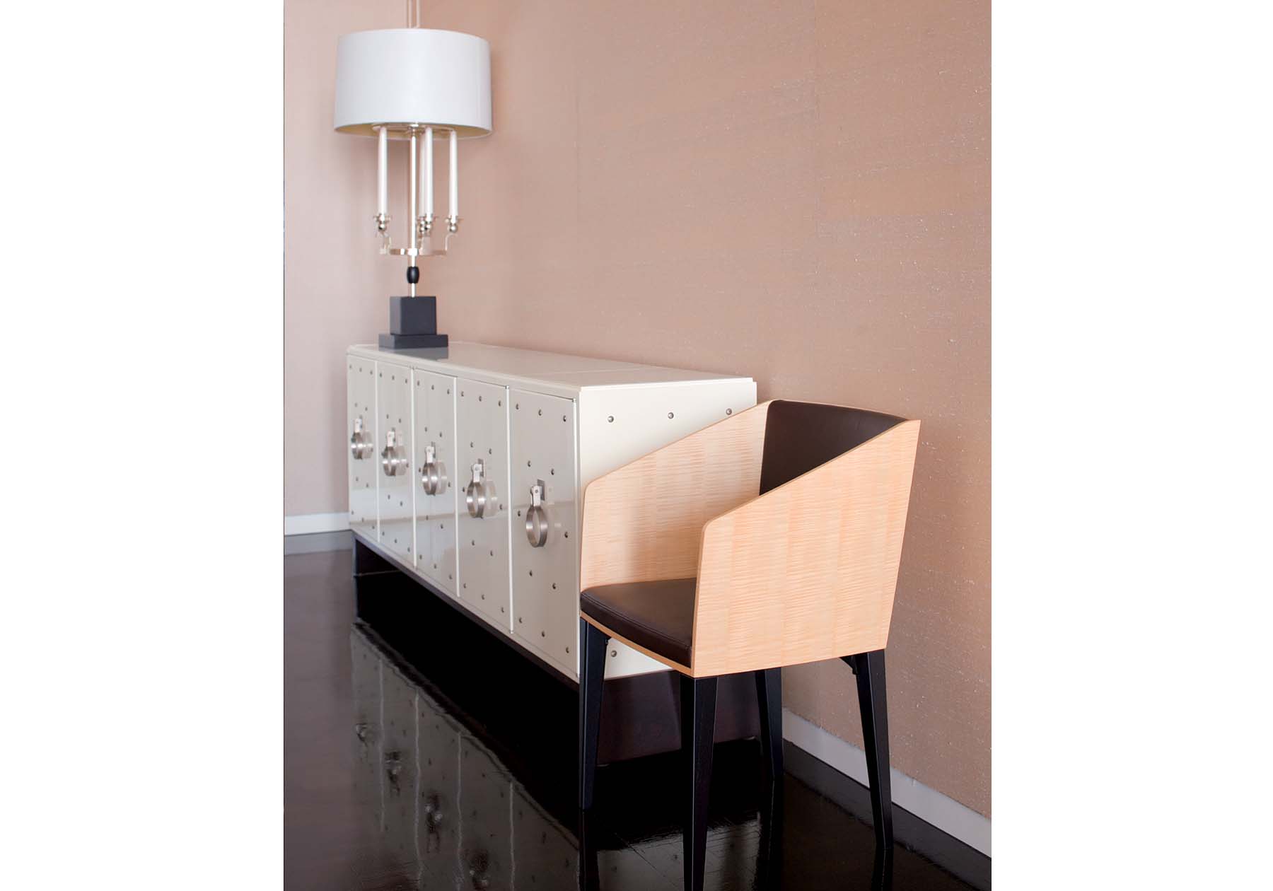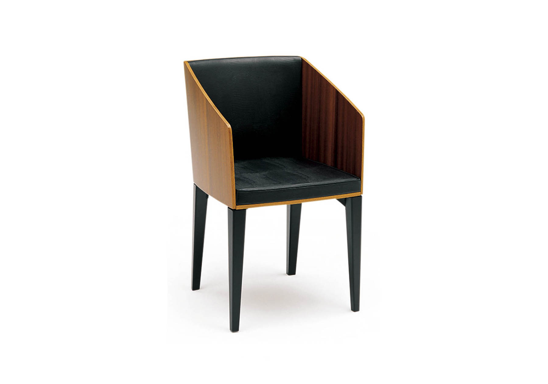上質感を醸し出す天然素材を使い、チェアのシェルには成型合板を用い、本体を支えるシンプルな脚部には強度を上げるためにアルミダイカストを使用しました。重厚かつシャープなデザインは、計算された構造を持つバルバの特徴でもあります。パーツ化された構造は、メンテナンス性に優れています。