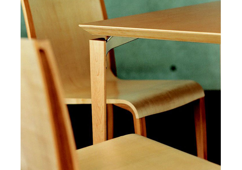 幕板を持たないミニマムなデザインは、ブラック仕上げのアルミダイカストのジョイントパーツが可能にしています。天板にはシャープなエッジのテーパータイプと柔らかな木口面のラウンドタイプを用意しました。
