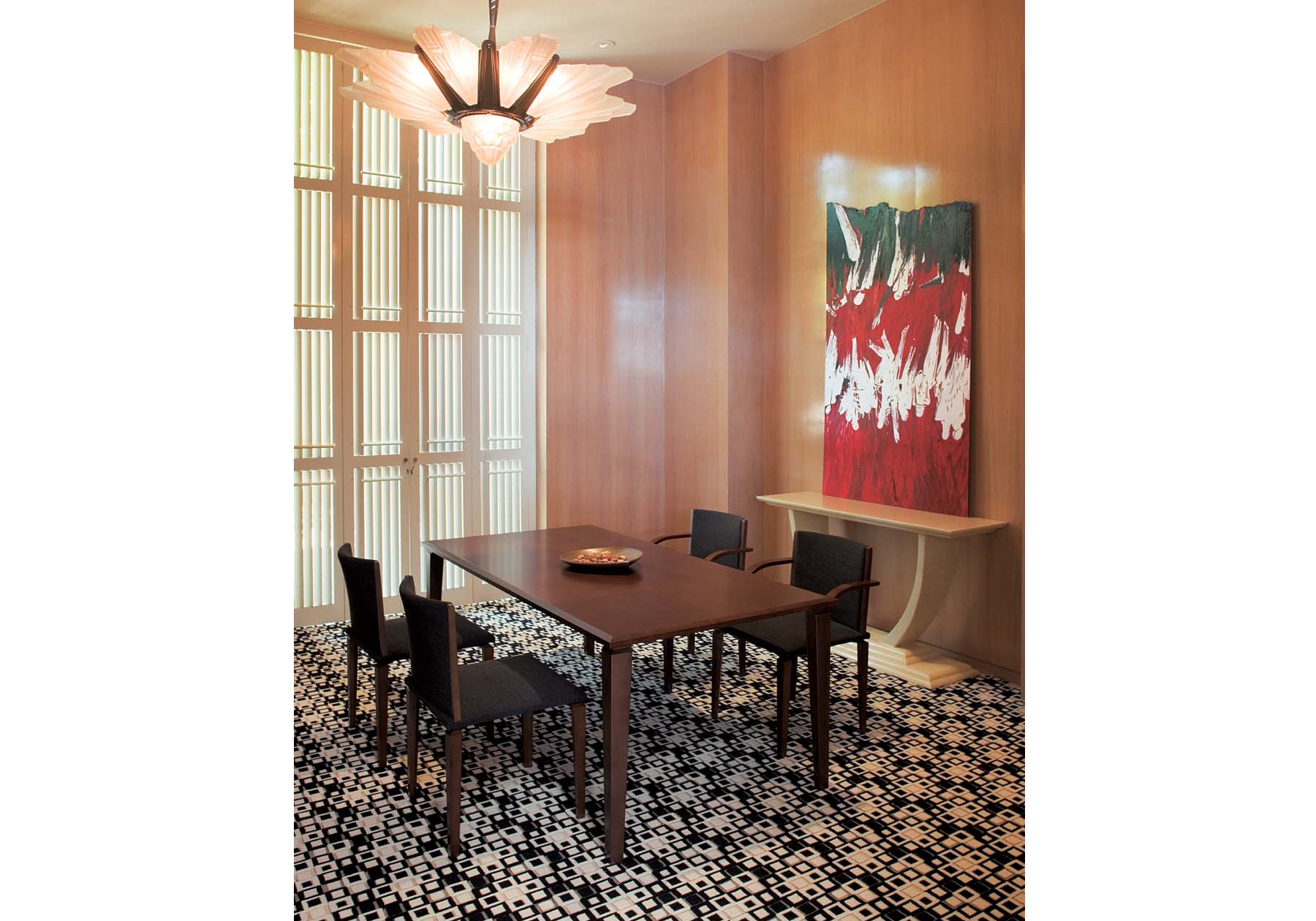 温かく気品ある天然木天板のテーブル。トップの張り分け突板が鮮やかな仕様です。